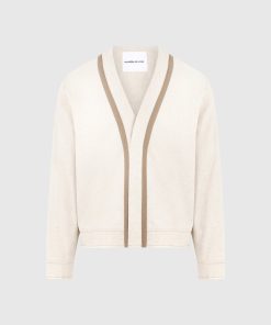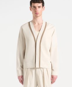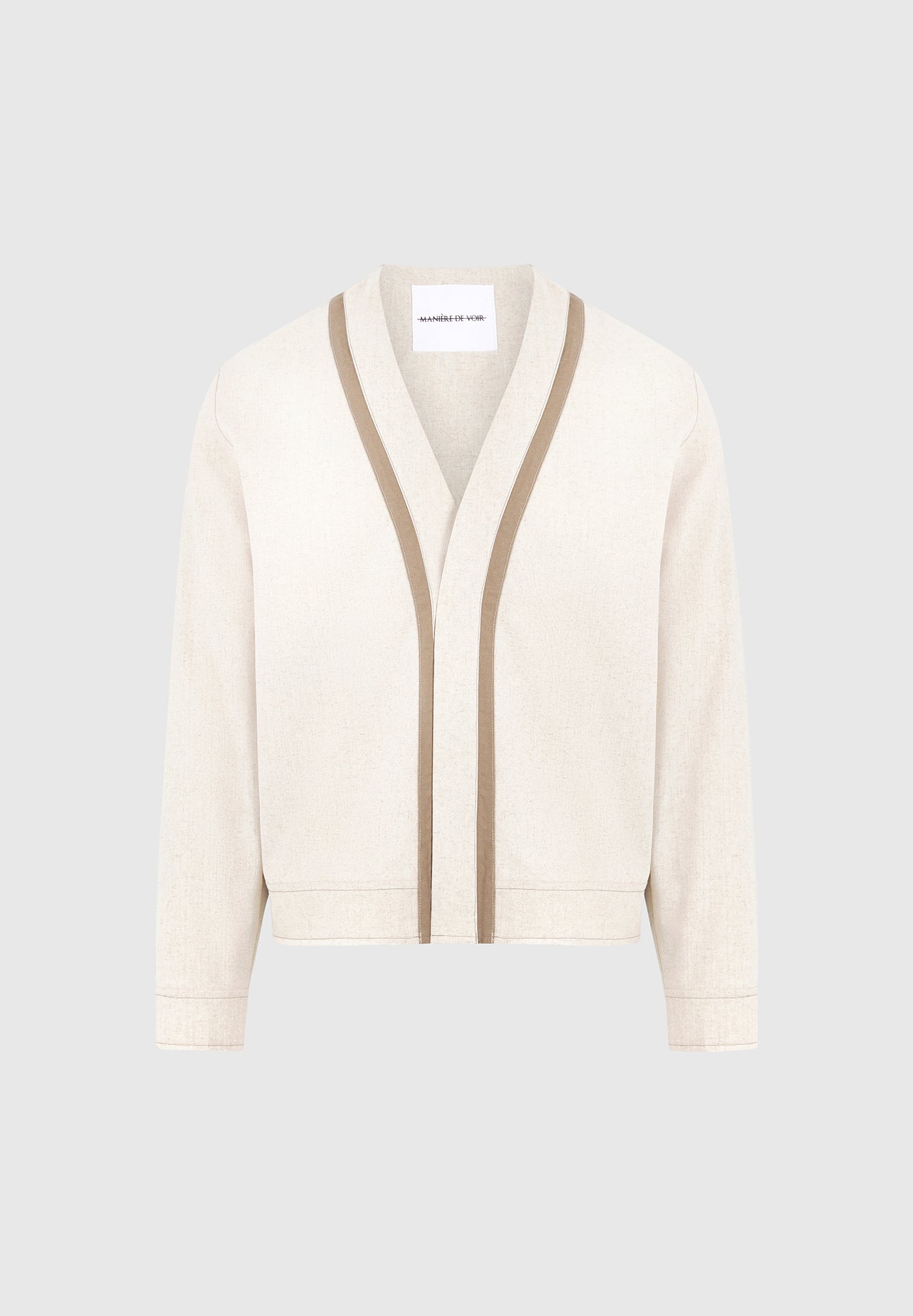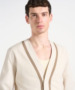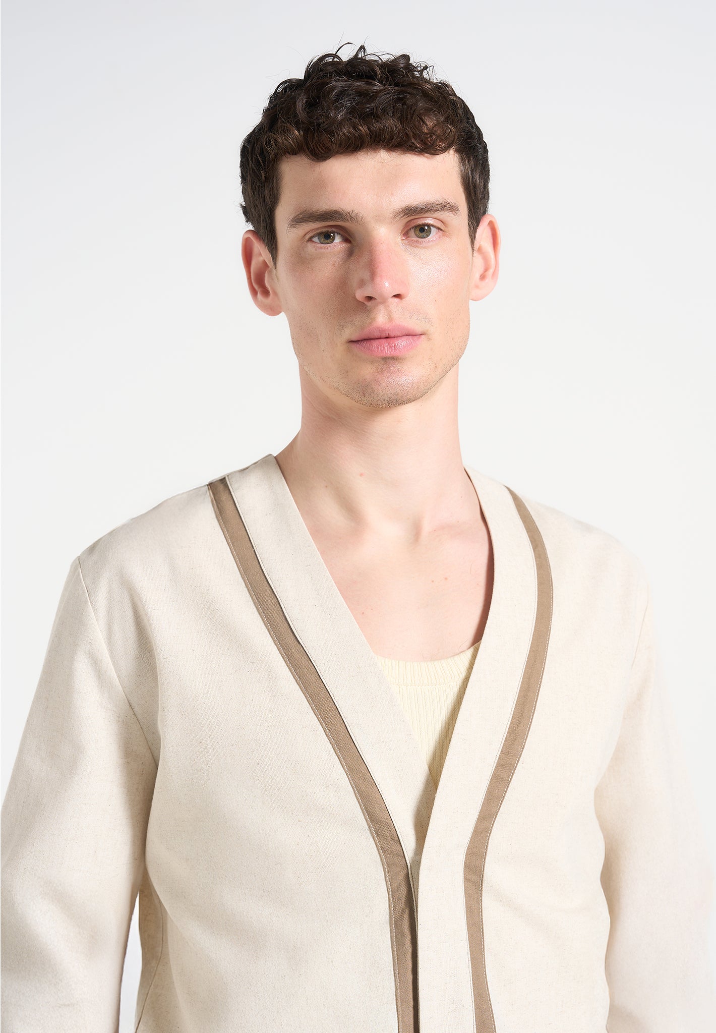 Blending lightweight tailoring effortlessly, the Linen Cardigan With Contrast Placket reinterprets layering through a clean, collarless silhouette and tonal contrast trim. The wide placket detailing runs uninterrupted through the front, anchored by a concealed button fastening that preserves its minimal aesthetic. Crafted in breathable linen, it’s ideal for transitional wear with elevated intent.