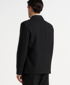 Designed with modern structure and finished with a contrast lapel, the double-breasted suit jacket features pocket detailing in a tonal yet distinctive finish. Angular welt pockets offer sharp, directional lines, while tonal buttons keep the look cohesive and minimal. A clean silhouette crafted for versatile styling.