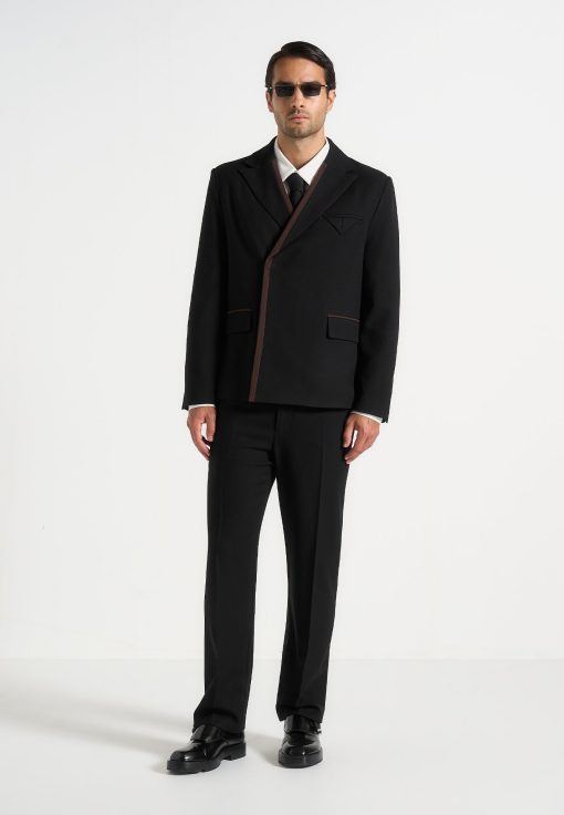 Designed with modern structure and finished with a contrast lapel, the double-breasted suit jacket features pocket detailing in a tonal yet distinctive finish. Angular welt pockets offer sharp, directional lines, while tonal buttons keep the look cohesive and minimal. A clean silhouette crafted for versatile styling.