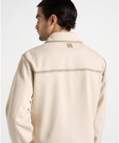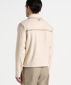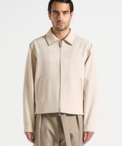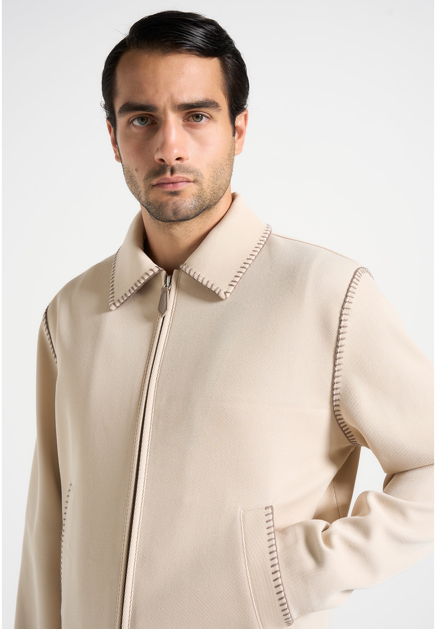 A sleek evolution of structure and detail, this piece is defined by its regular fit and refined silhouette. Contrasting whipstitch seams add edge, while a two-way zip and invisible pockets offer clean functionality. Finished with satin lining for added comfort.
