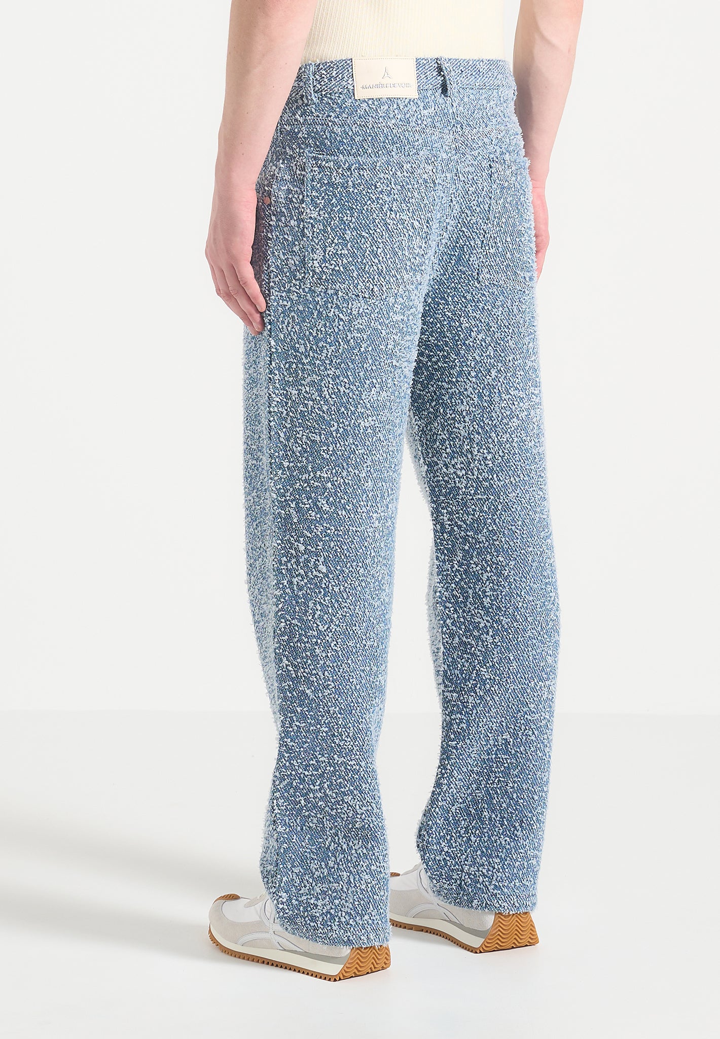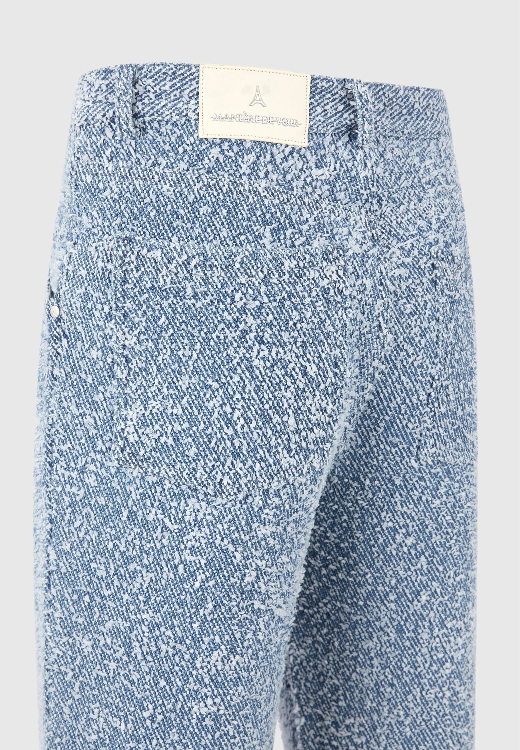Reimagining denim through a tailored lens, the Pleated Jeans introduce front-pleat construction to a textured, bouclé denim for an unexpected fusion of structure and softness. The relaxed leg and tailored waistband elevate the silhouette, while the tactile surface adds dimension to everyday styling.