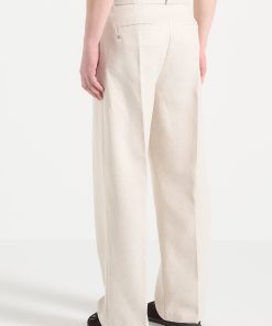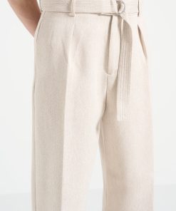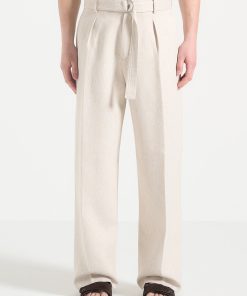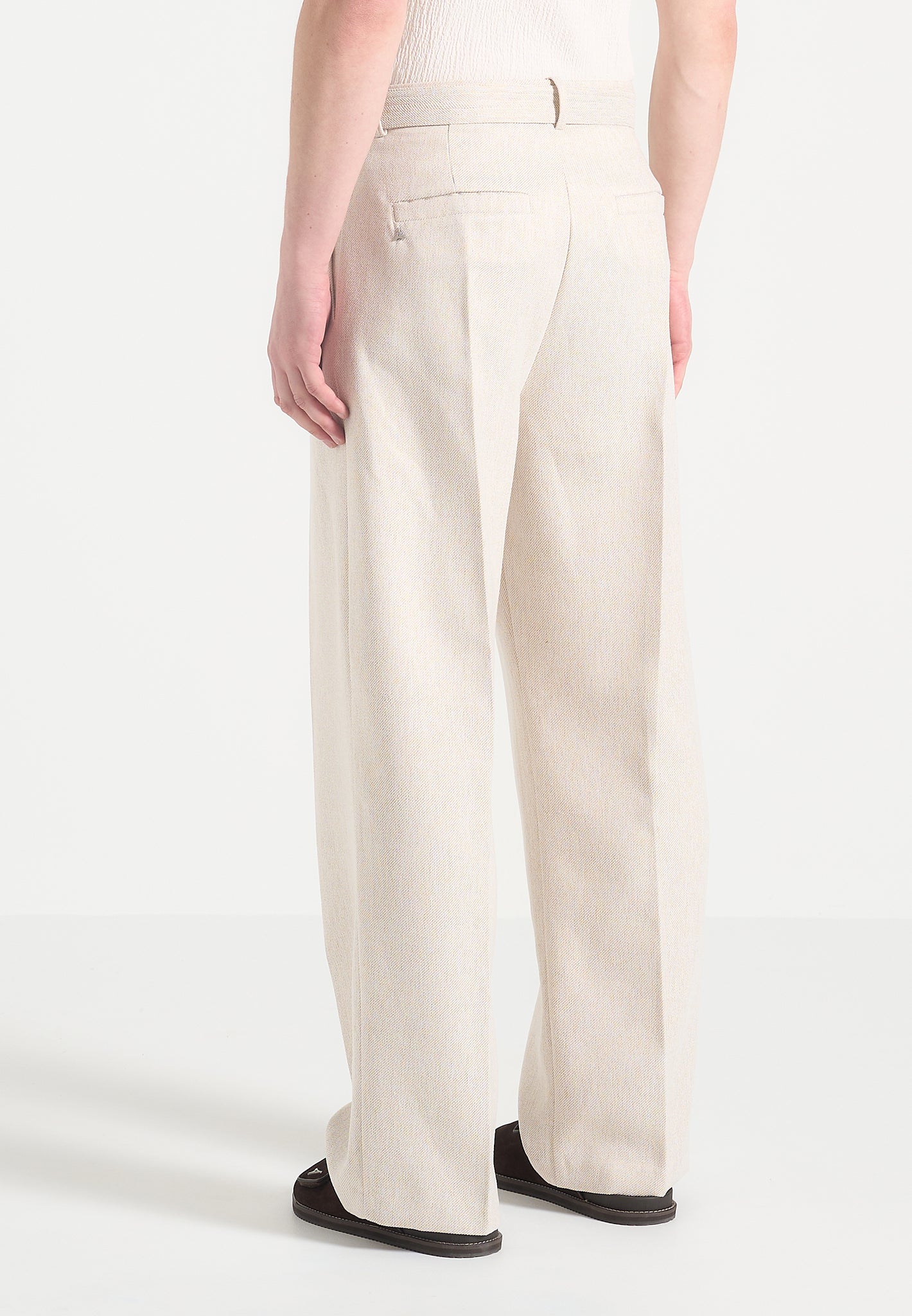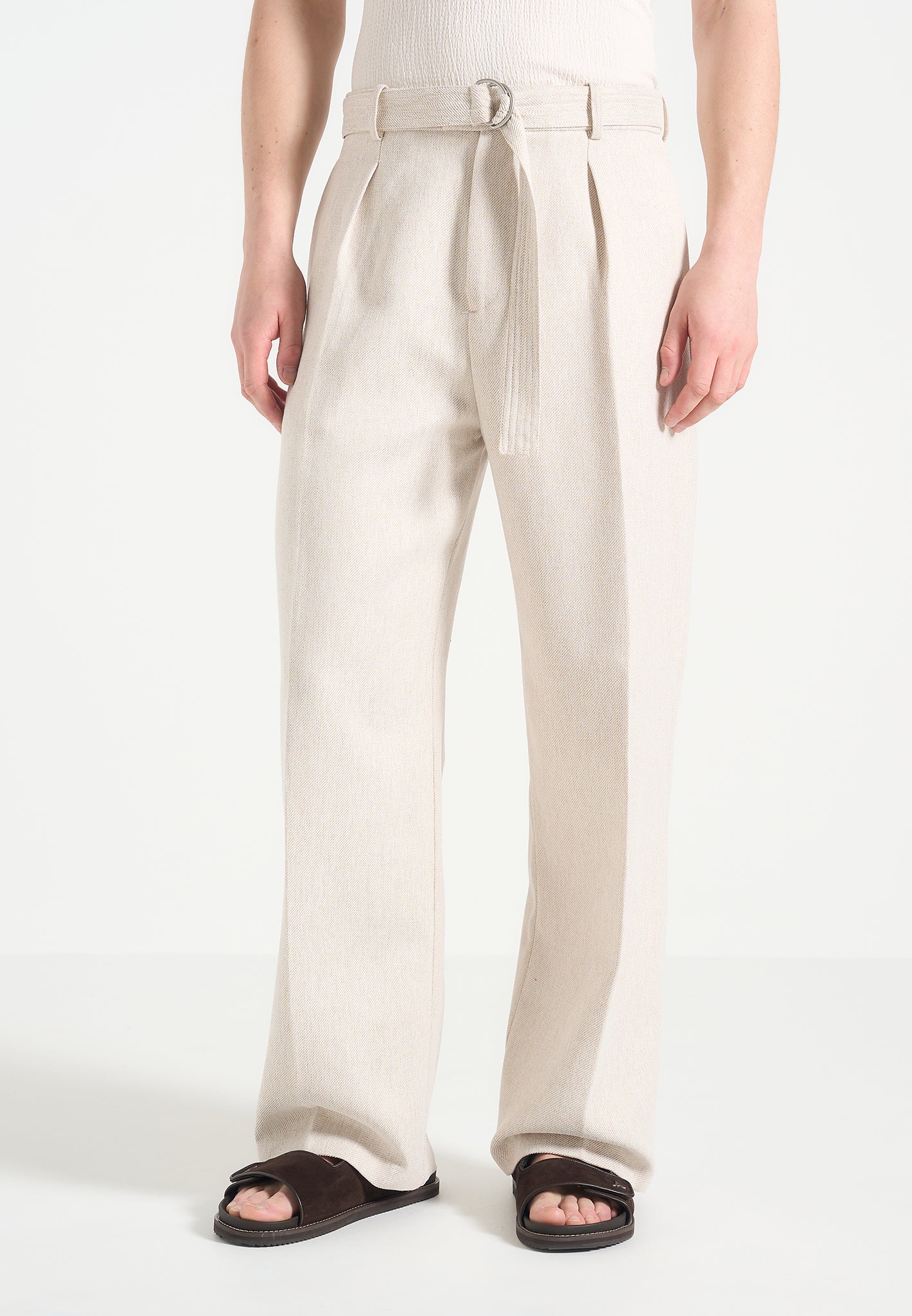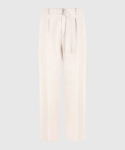 The Relaxed Fit Wide Leg Belted Trousers reinterpret volume with quiet confidence, cut in a wide silhouette and finished with a built-in self-fabric belt for integrated waist control. Deep front pleats enhance the drape through the leg, while the structured waistband and pressed creases maintain a clean, tailored frame from top to cuff.