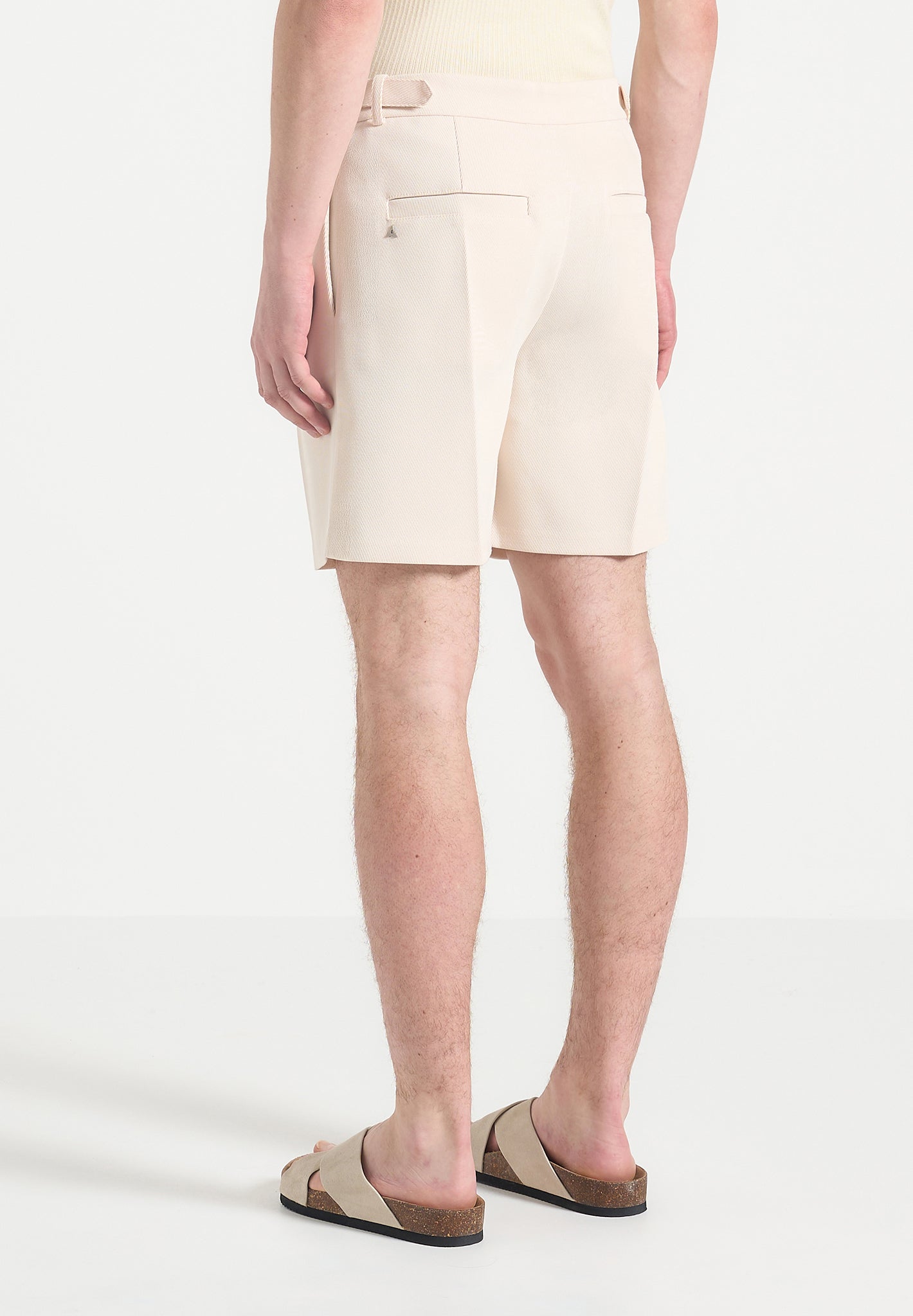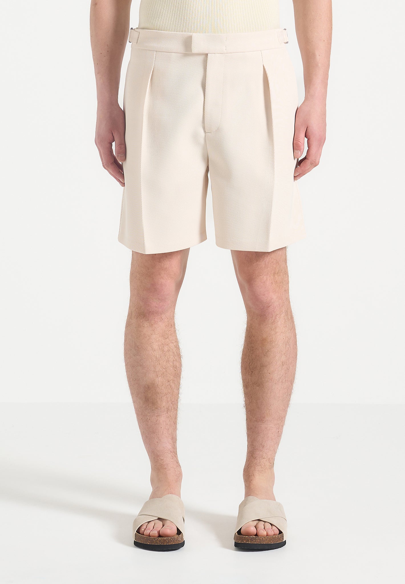 The Twill Pleated Shorts are engineered for precision and adaptability, combining sharp tailoring with functional refinement. Crafted from structured twill for a clean, architectural silhouette, they feature defined front pleats and an extended waistband design. The standout adjustable side tabs allow for a personalised fit, seamlessly integrated into the waistband for a clean finish that enhances both comfort and style.