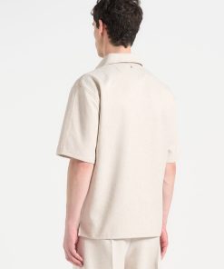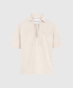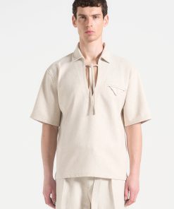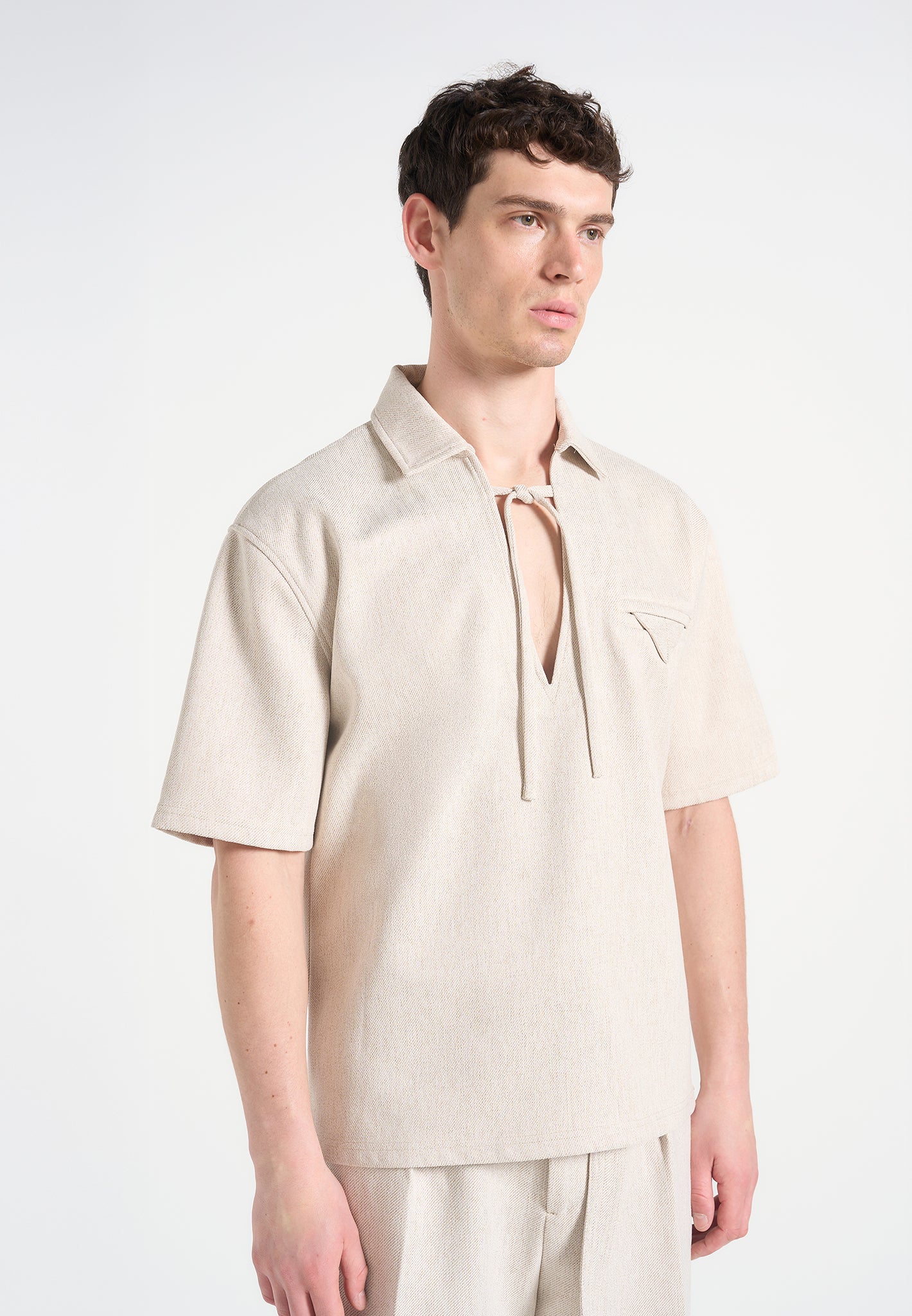 The Open Collar Textured Drawstring Shirt blends relaxed tailoring with subtle technical nuance. Crafted from a softly textured fabric, it features a contrast drawstring threaded through the open neckline, allowing for adjustable styling and added shape. A folded flap chest pocket introduces a sculptural touch to an otherwise fluid silhouette.