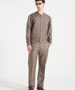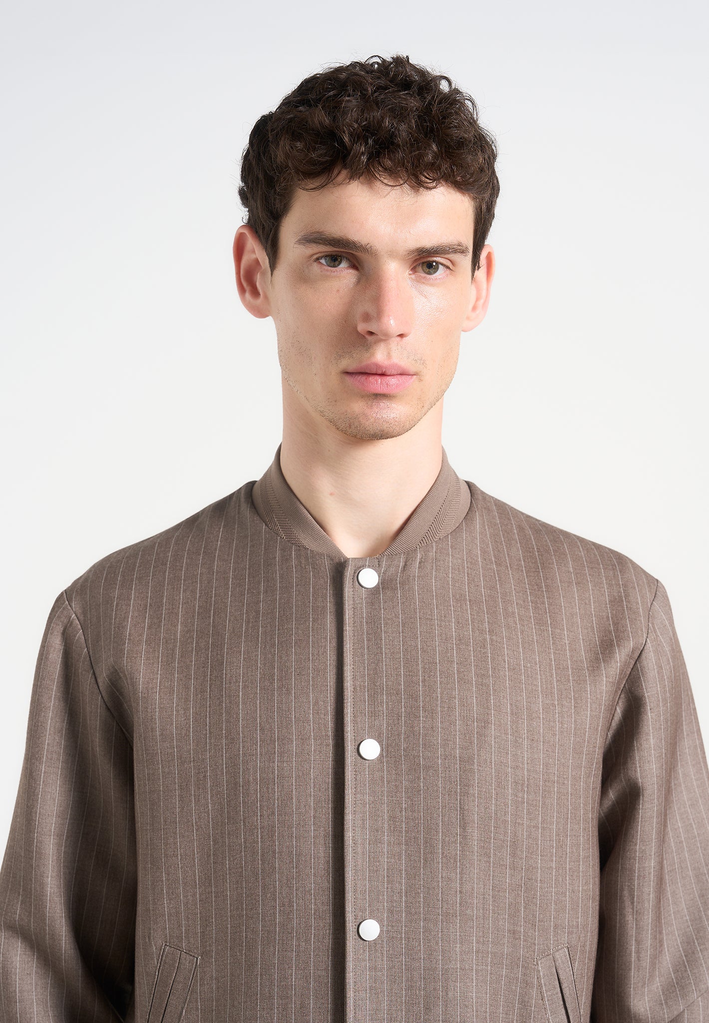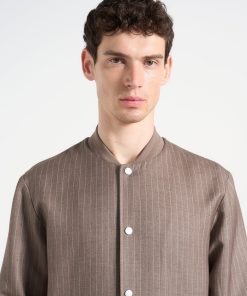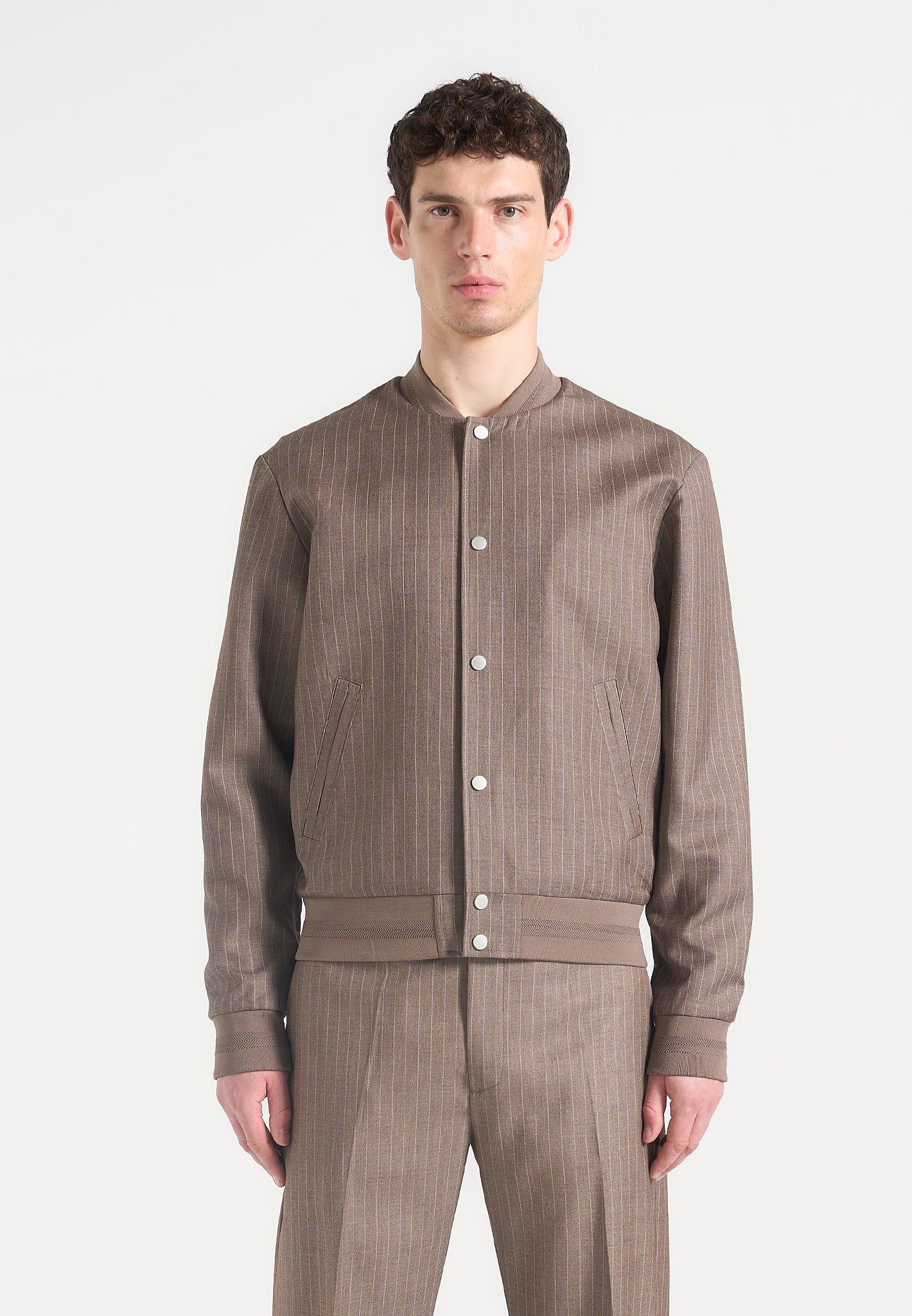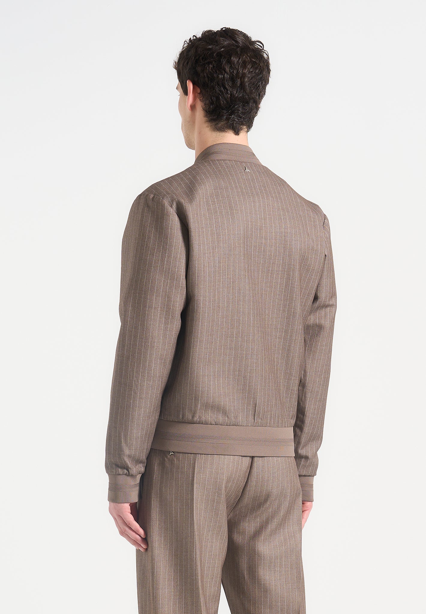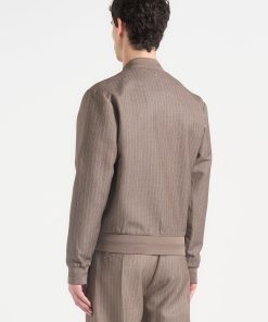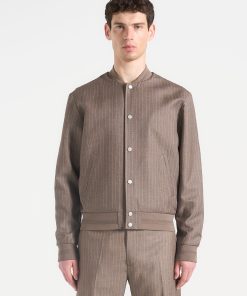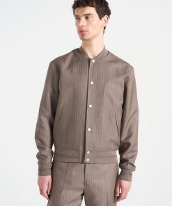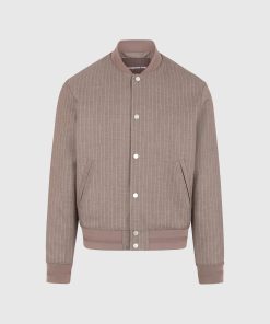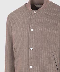 - Tailored Pinstripe Fabric Elevates the Traditional Bomber Cut