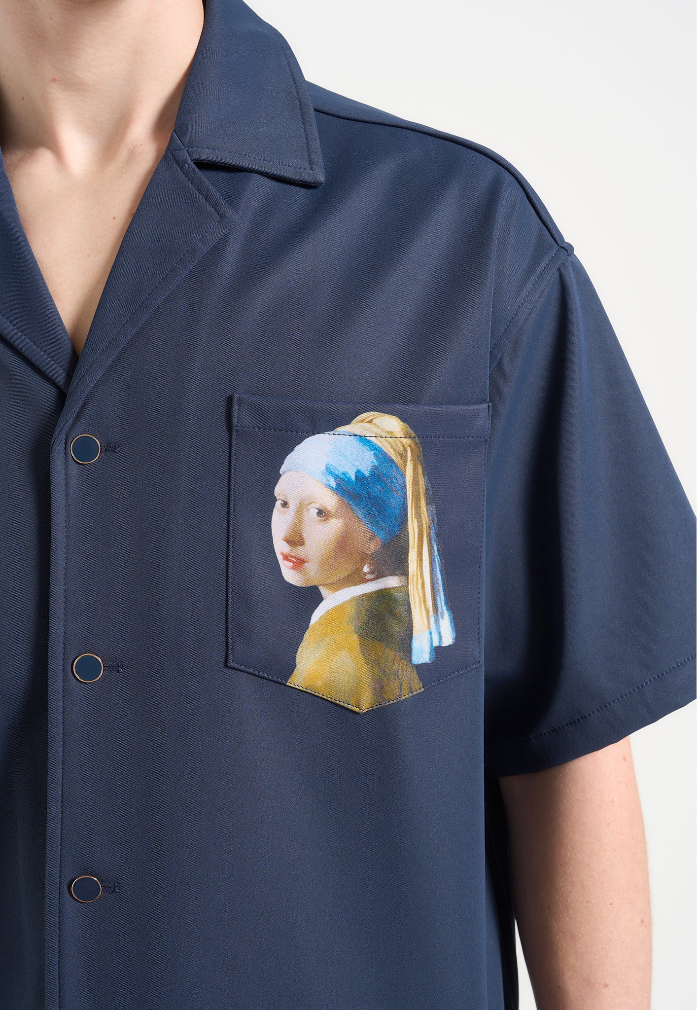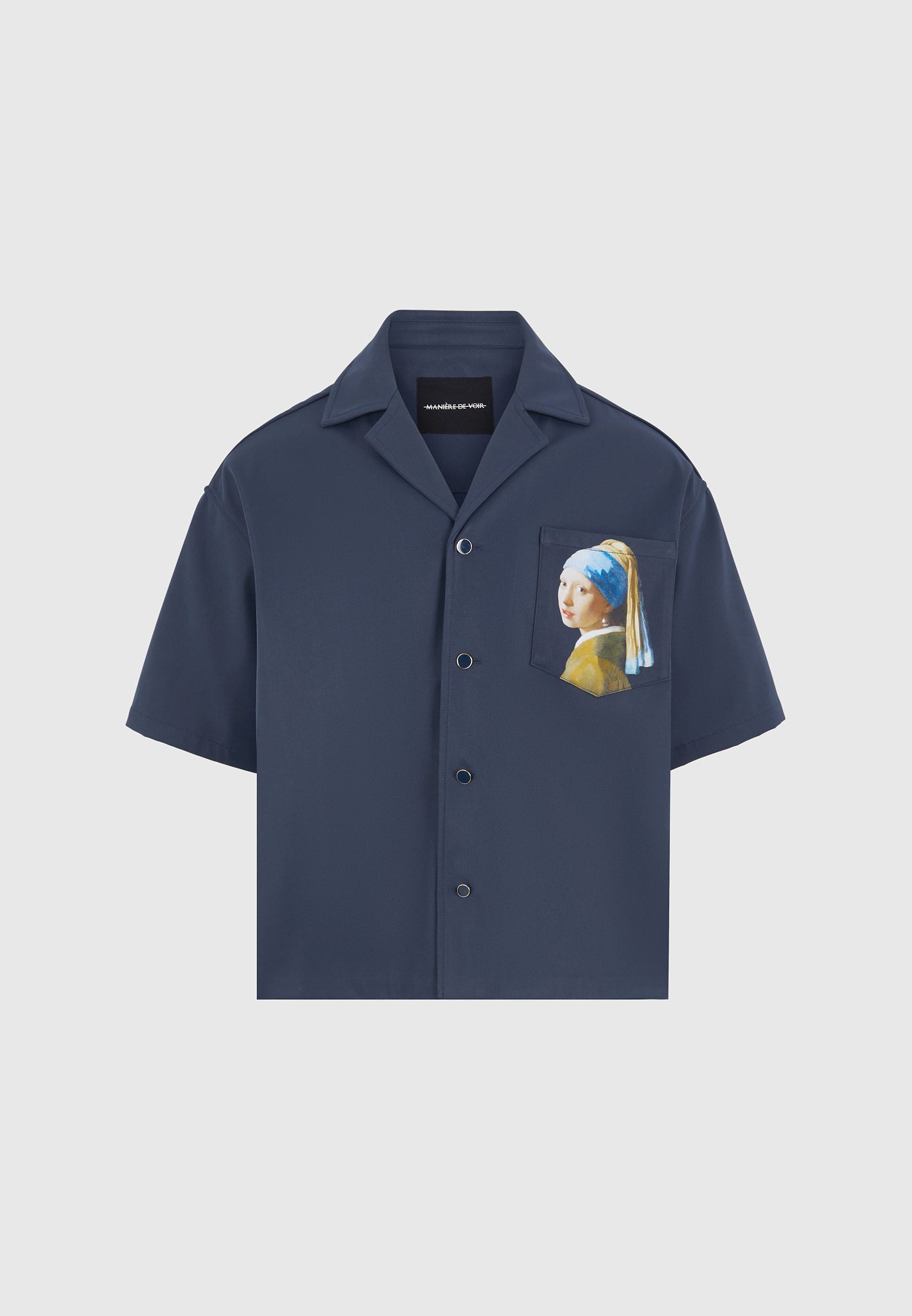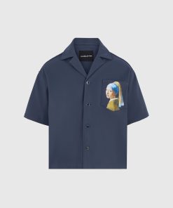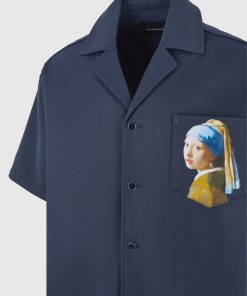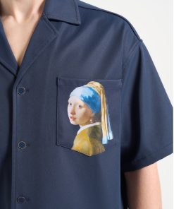 A fusion of art history and contemporary tailoring, the “Girl With A Pearl Earring” Boxy Shirt reframes a Renaissance classic through a modern lens. Featuring a digitally rendered chest print of Vermeer’s famed portrait, its oversized cut and clean revere collar balance statement design with wearable structure.