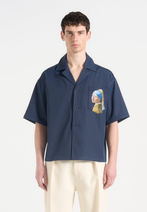 A fusion of art history and contemporary tailoring, the “Girl With A Pearl Earring” Boxy Shirt reframes a Renaissance classic through a modern lens. Featuring a digitally rendered chest print of Vermeer’s famed portrait, its oversized cut and clean revere collar balance statement design with wearable structure.