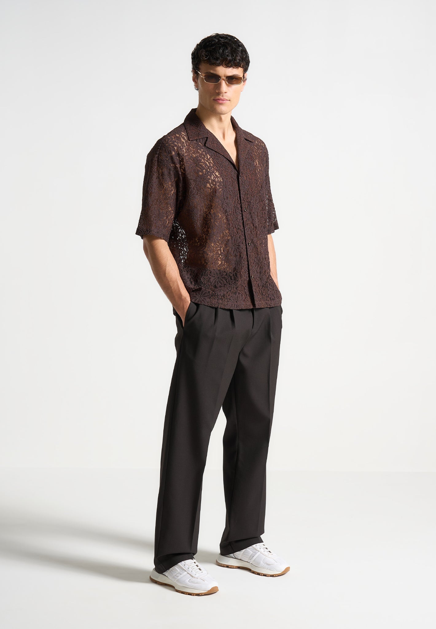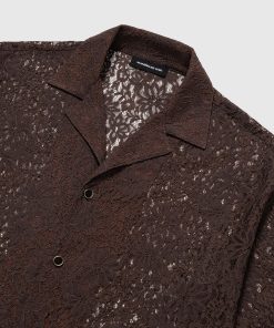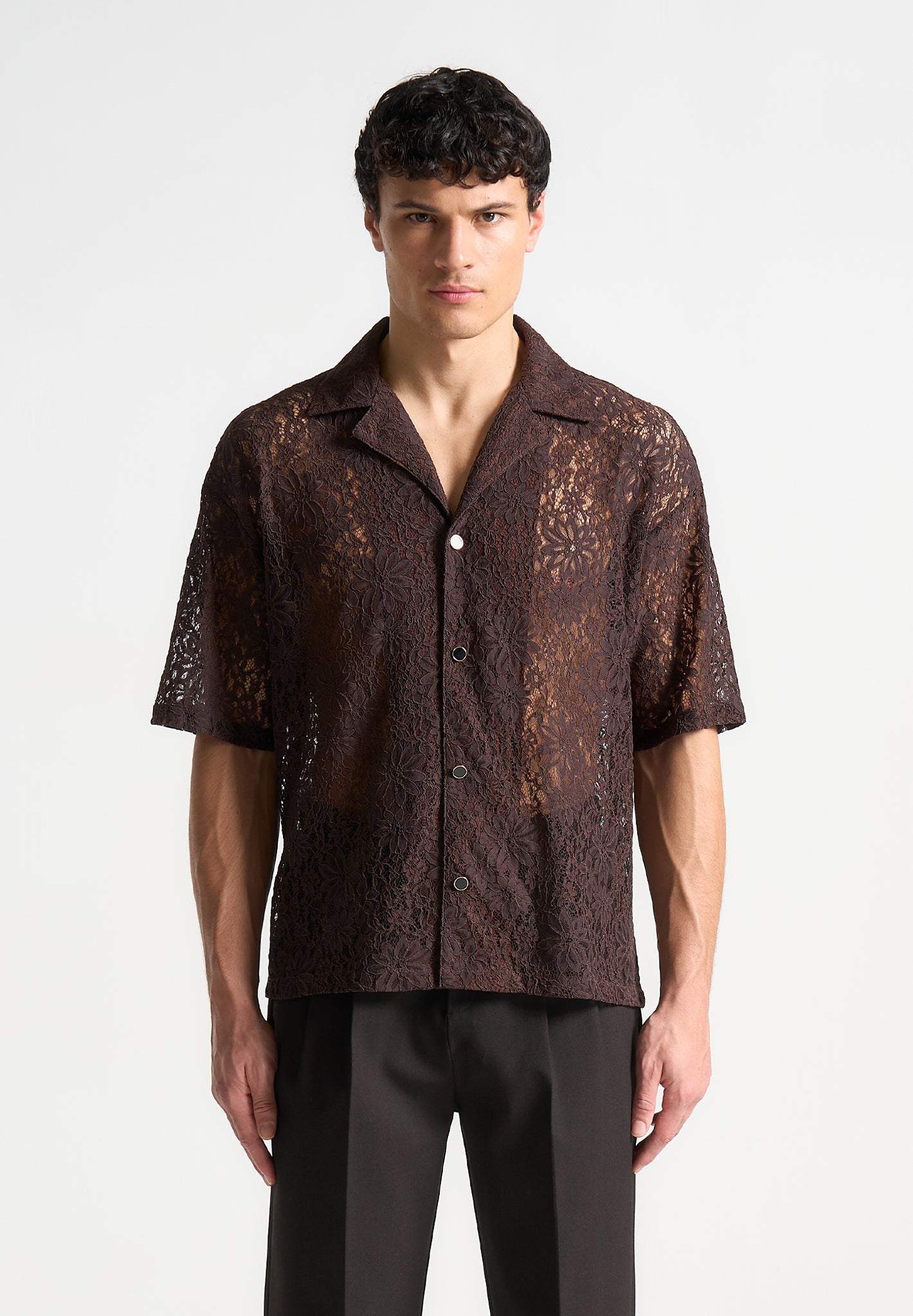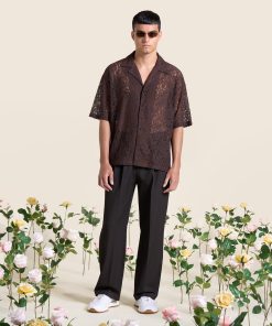 Meticulously crafted with delicate lace, the Boxy Lace Revere Shirt seamlessly merges breathability with sophistication. The Revere collar and boxy fit emanates masculinity and refinement, while the subtle gold-rim button detailing adds a touch of understated luxury. Versatile for any occasion, this shirt is an essential wardrobe staple.