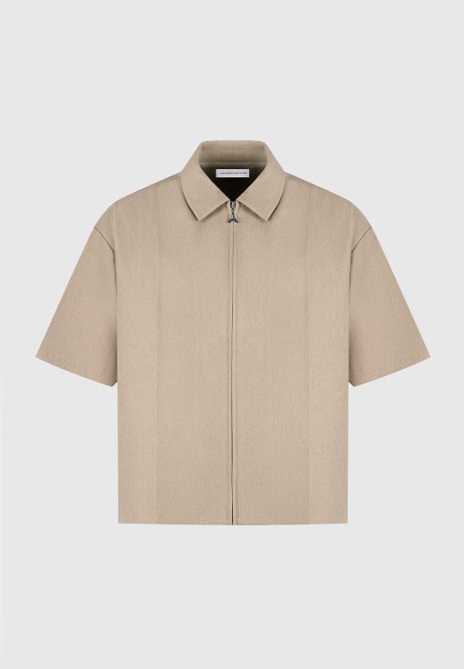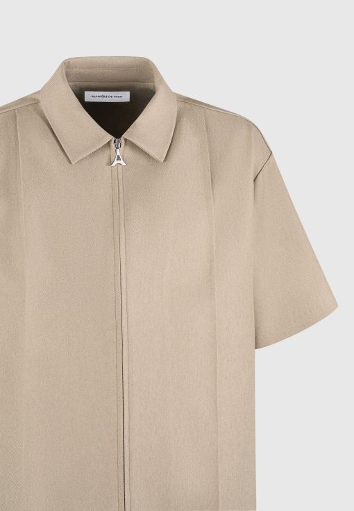 This Boxy Shirt is a versatile addition to any wardrobe. The concealed frontal zip provides a sleek and modern look, while the crease detail adds a refined touch. The neutral tone and classic collar make it easy to dress up or down, perfect for any occasion.