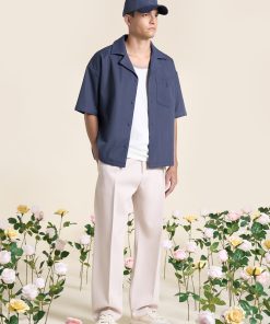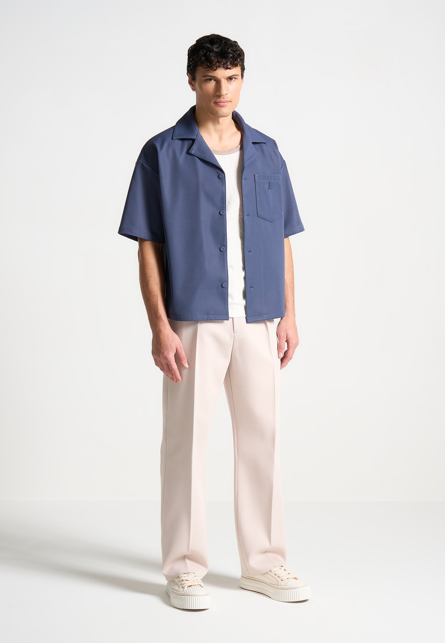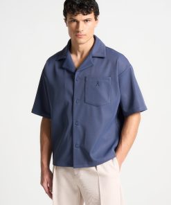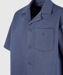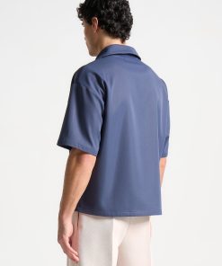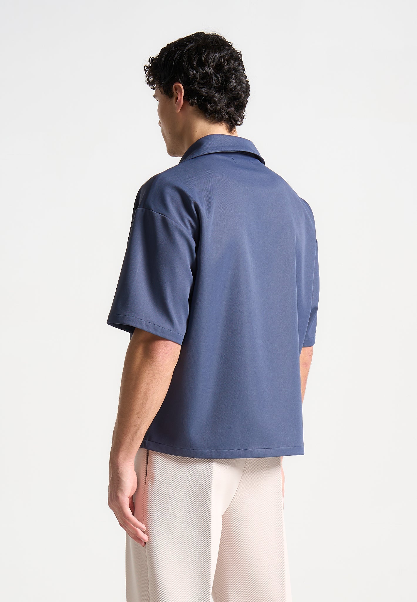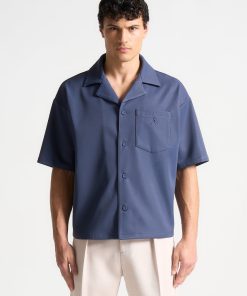 Elevate your wardrobe with our Boxy Twill Revere Shirt in Steel Blue, meticulously tailored with a boxy fit to suit any body type. The tonal embroidery on the front pocket adds a refined touch, complemented by the tonal fabric covered buttons and revere collar to complete the ensemble.