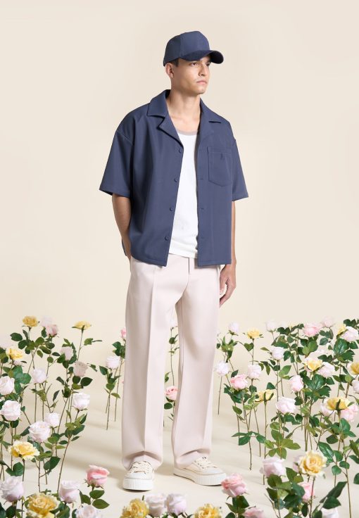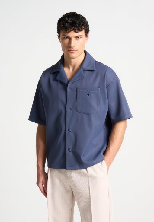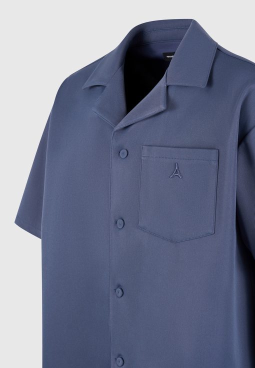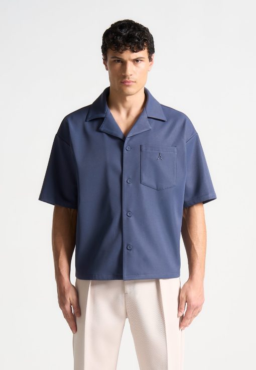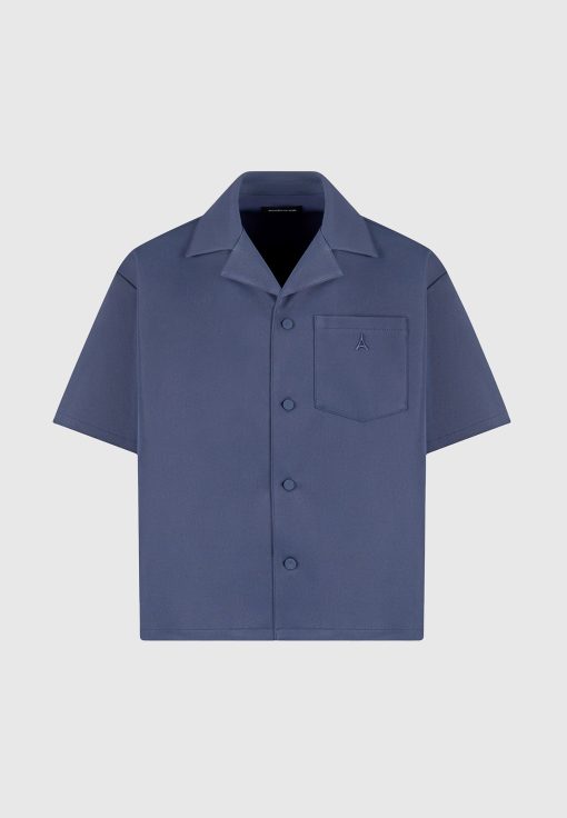 Elevate your wardrobe with our Boxy Twill Revere Shirt in Steel Blue, meticulously tailored with a boxy fit to suit any body type. The tonal embroidery on the front pocket adds a refined touch, complemented by the tonal fabric covered buttons and revere collar to complete the ensemble.