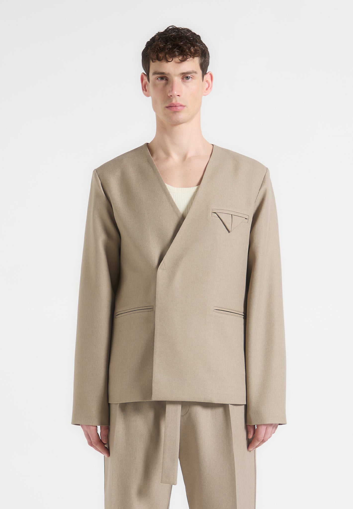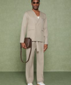 Refine your look with the Collarless Double-Breasted Minimal Blazer, a modern approach to refined tailoring that offers a sleek, structured silhouette with a contemporary edge. The open v-neck collar enhances its minimalist appeal, while the discreet button fastening ensures a sharp, polished look.