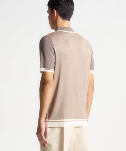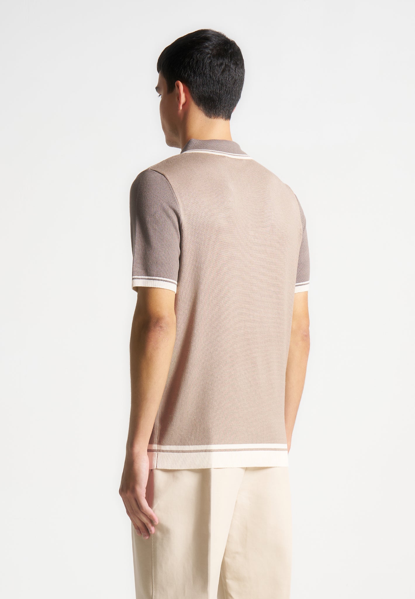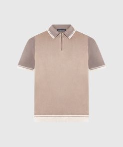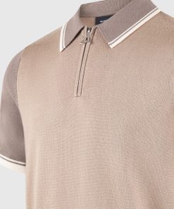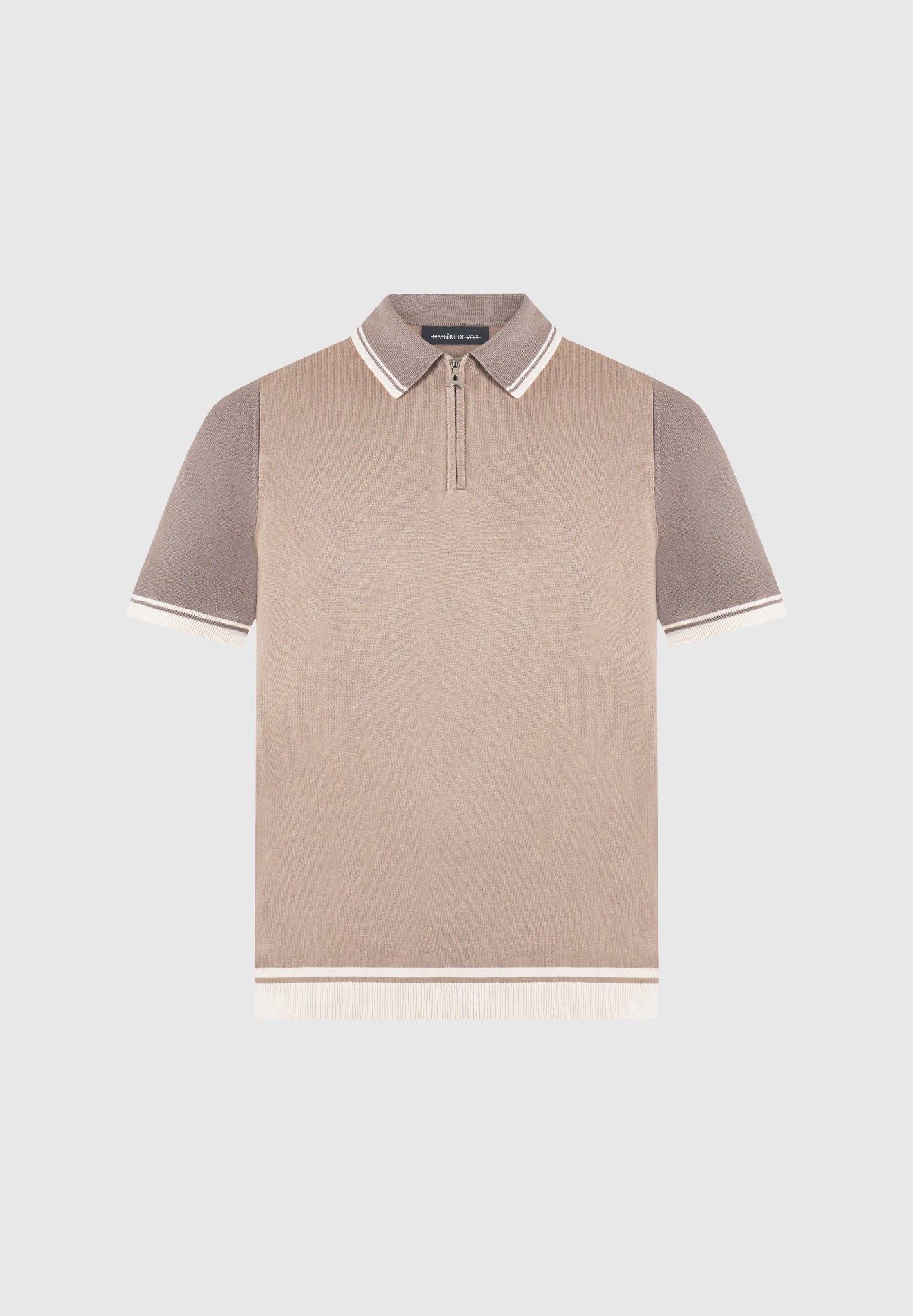 Experience unparalleled comfort and style with our Colour Block Zip Polo Shirt in Taupe. Boasting a short sleeve, fitted silhouette with a unique contrasting collar and sleeve, this Polo Shirt exudes effortless refinement for any casual or smart casual occasion.