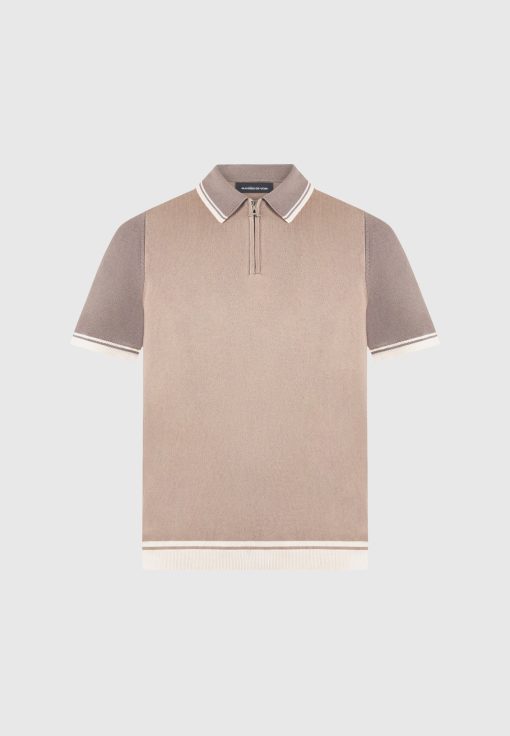 Experience unparalleled comfort and style with our Colour Block Zip Polo Shirt in Taupe. Boasting a short sleeve, fitted silhouette with a unique contrasting collar and sleeve, this Polo Shirt exudes effortless refinement for any casual or smart casual occasion.