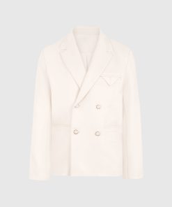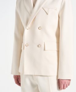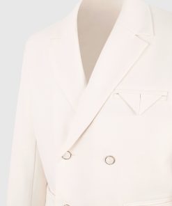 The Double Breasted Pinstripe Suit Jacket is a clean expression of modern tailoring. Cut from lightweight pinstripe suiting fabric, it features a sharp four-button front and peak lapels for a structured silhouette. Finished with flap pockets and an angular chest pocket, it brings subtle detail and strong form to spring tailoring.