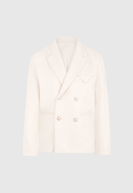 The Double Breasted Pinstripe Suit Jacket is a clean expression of modern tailoring. Cut from lightweight pinstripe suiting fabric, it features a sharp four-button front and peak lapels for a structured silhouette. Finished with flap pockets and an angular chest pocket, it brings subtle detail and strong form to spring tailoring.