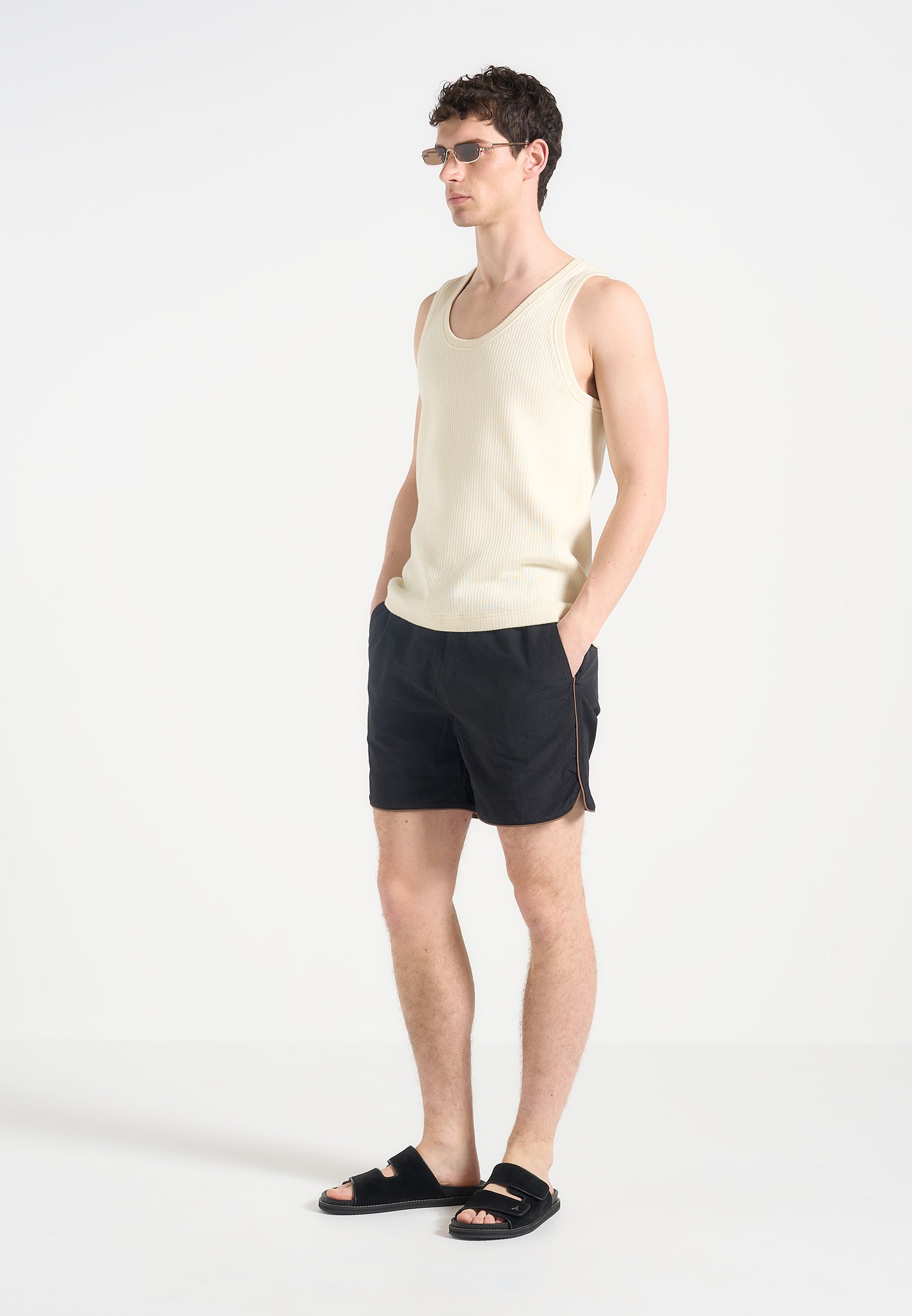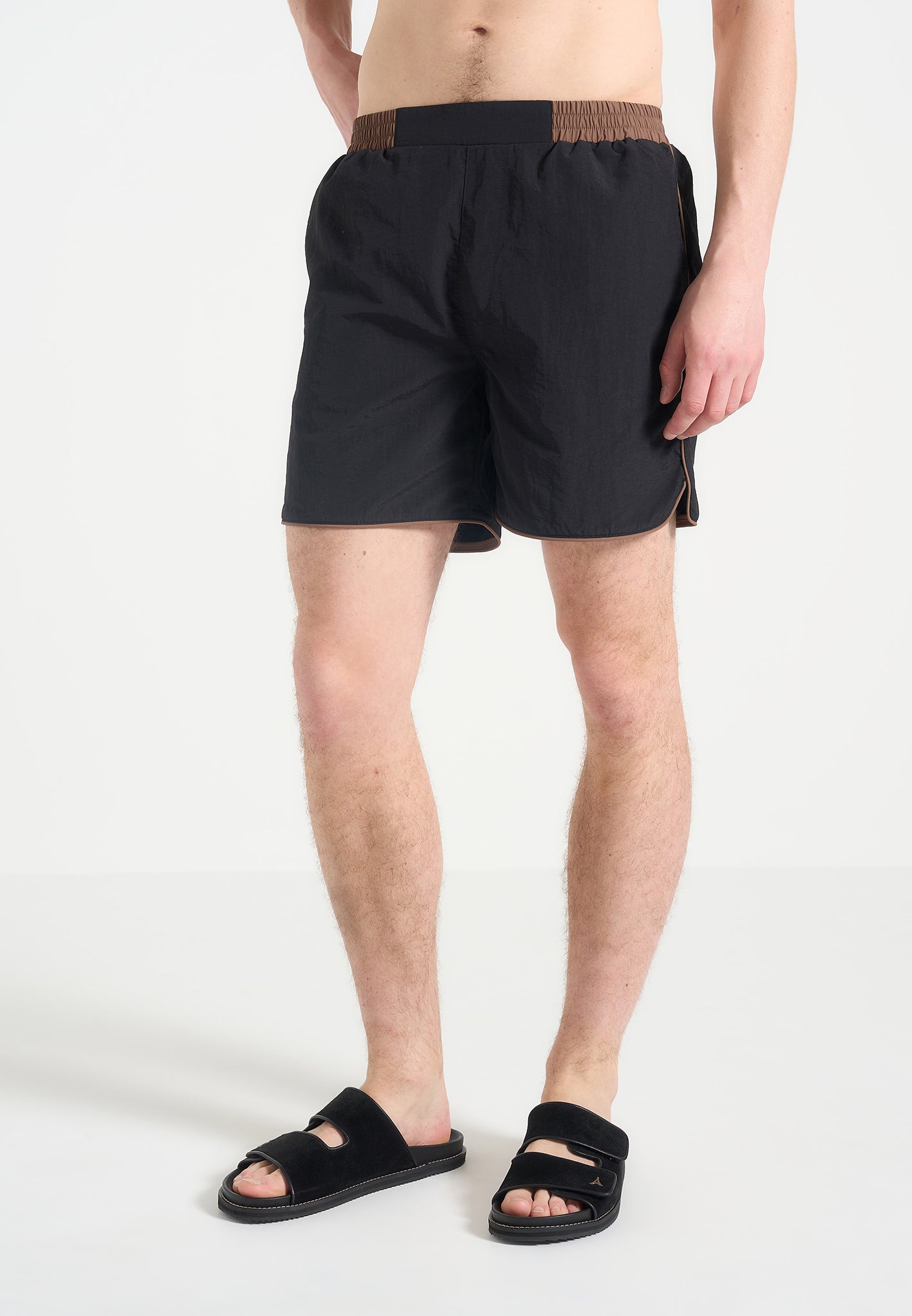 The Swim Shorts with Contrast Waist Band fuse utility with standout design, featuring a bold contrast elastic waistband that anchors the look while ensuring adaptive comfort. Designed for both poolside and street styling, the sharp piping trim reinforces the tailored shape, while the quick-dry fabrication delivers performance without compromise.
