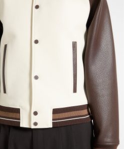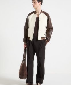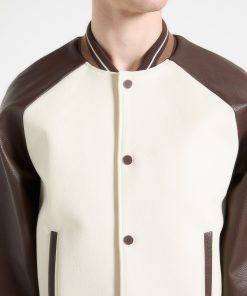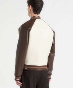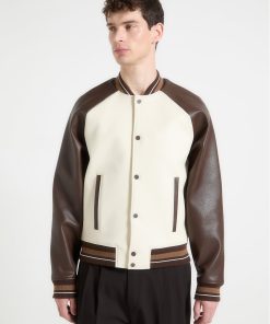 The Contrast Leather Bomber is a bold reinterpretation of a timeless classic, blending modern design with refined craftsmanship. Made from high-quality vegan leather with a textured, polished finish, it features distinctive contrast raglan sleeves and striped ribbed trims for a striking yet versatile look.