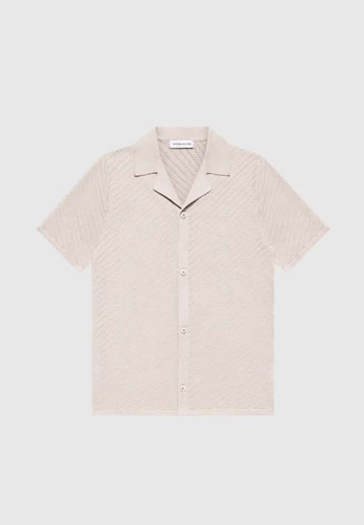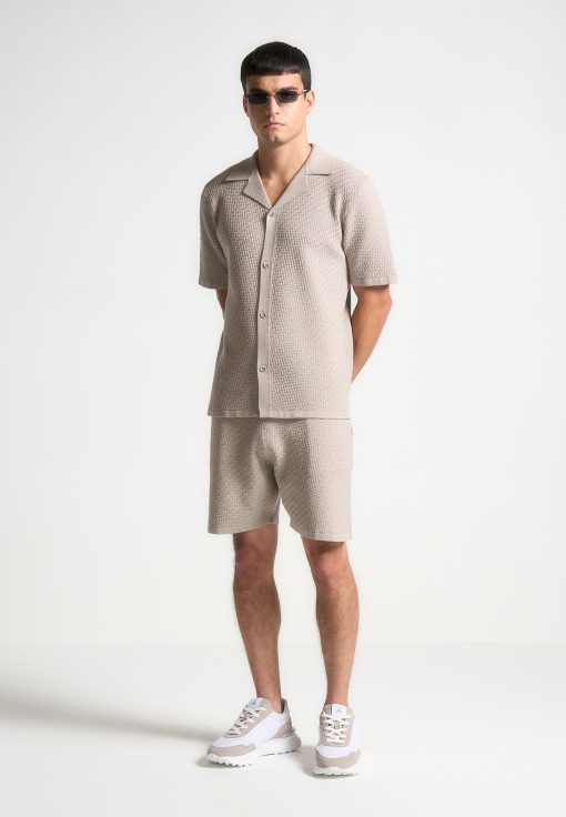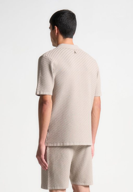 Crafted from high-quality fabrics, our Taupe Herringbone Knit Revere Shirt offers a classic, comfortable look. Featuring a revere collar and short sleeve silhouette, it pairs seamlessly with our Herringbone Knit Shorts. Enhance your wardrobe this summer with this timeless and adaptable piece.