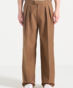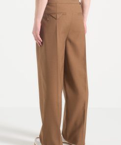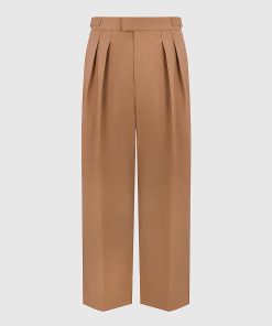 The Wide Leg Twin Pleat Tailored Trousers are constructed with directional volume through sharp twin front pleats, allowing the fabric to fall cleanly while preserving structure. Integrated side adjusters are engineered into the waistband for a seamless fit refinement system, eliminating the need for a belt without compromising on silhouette control.