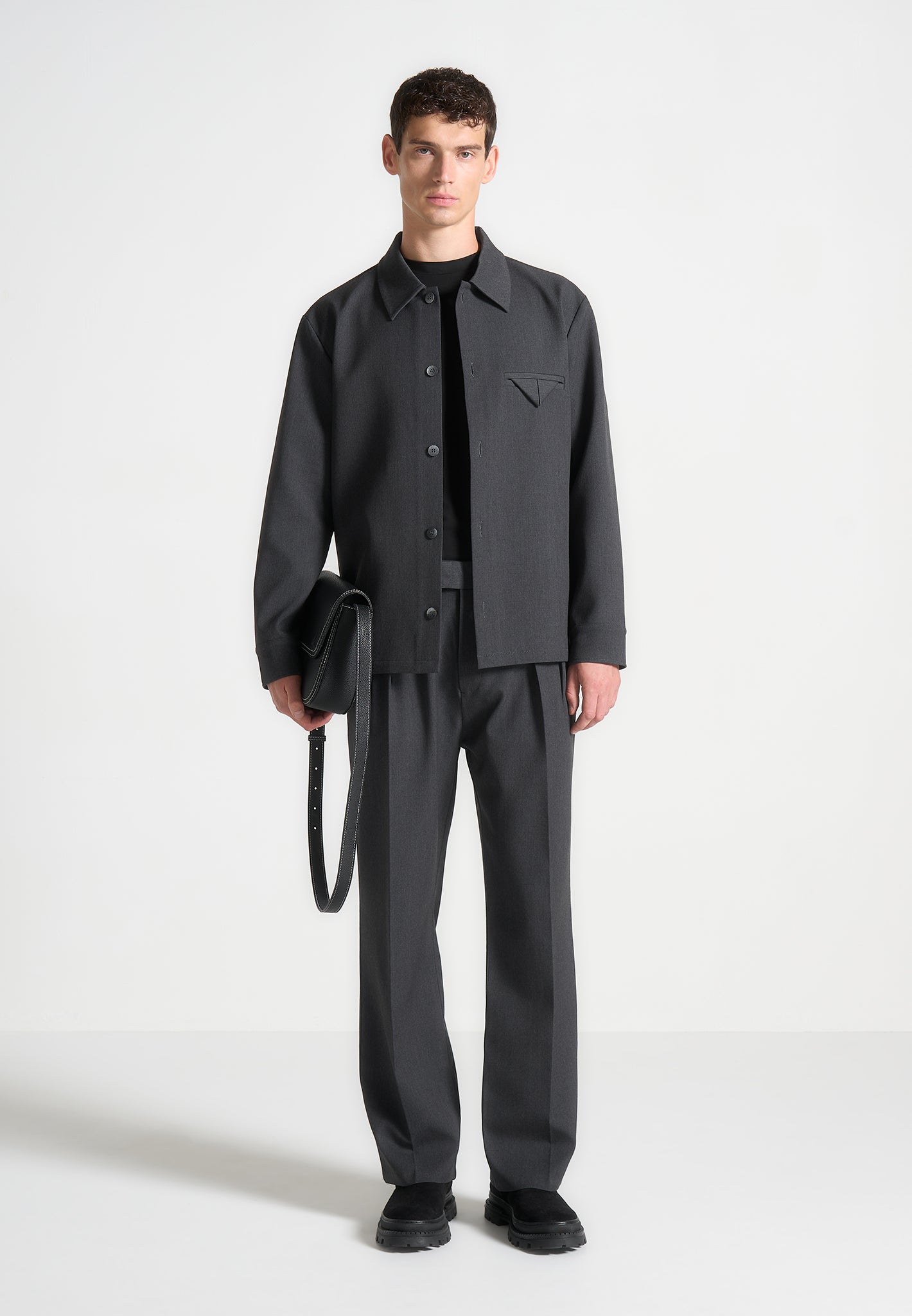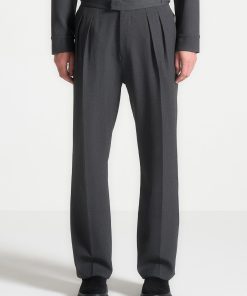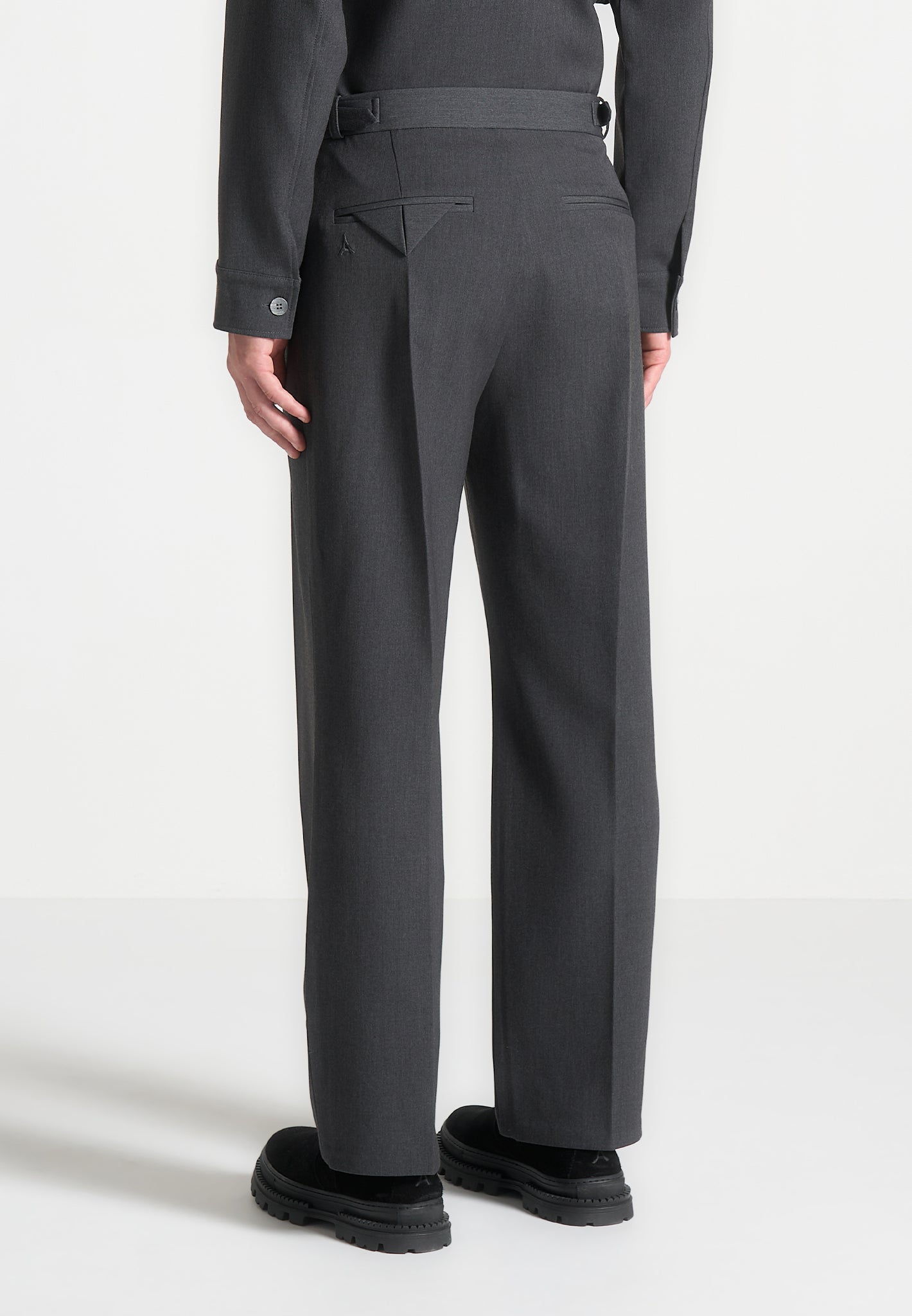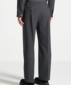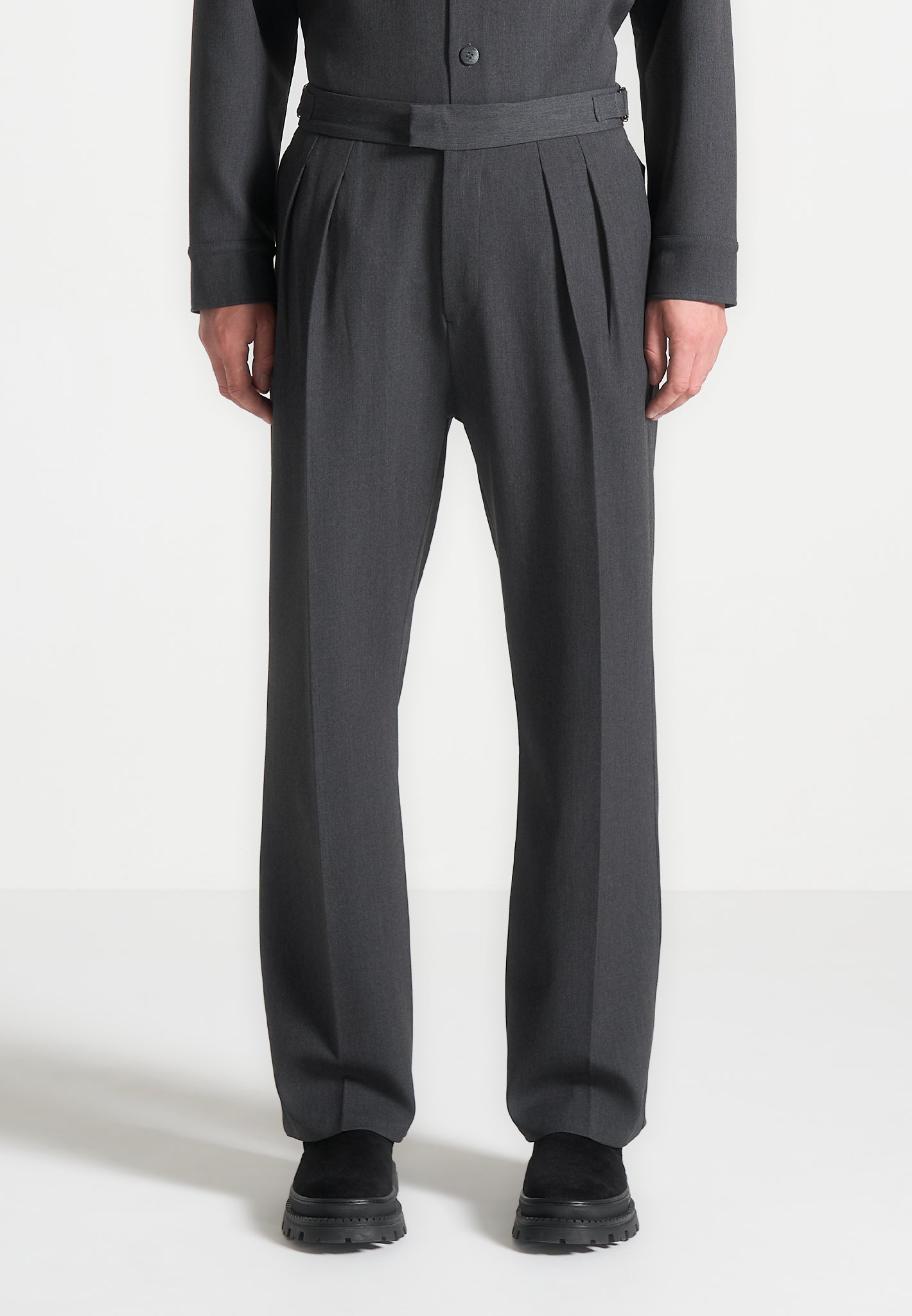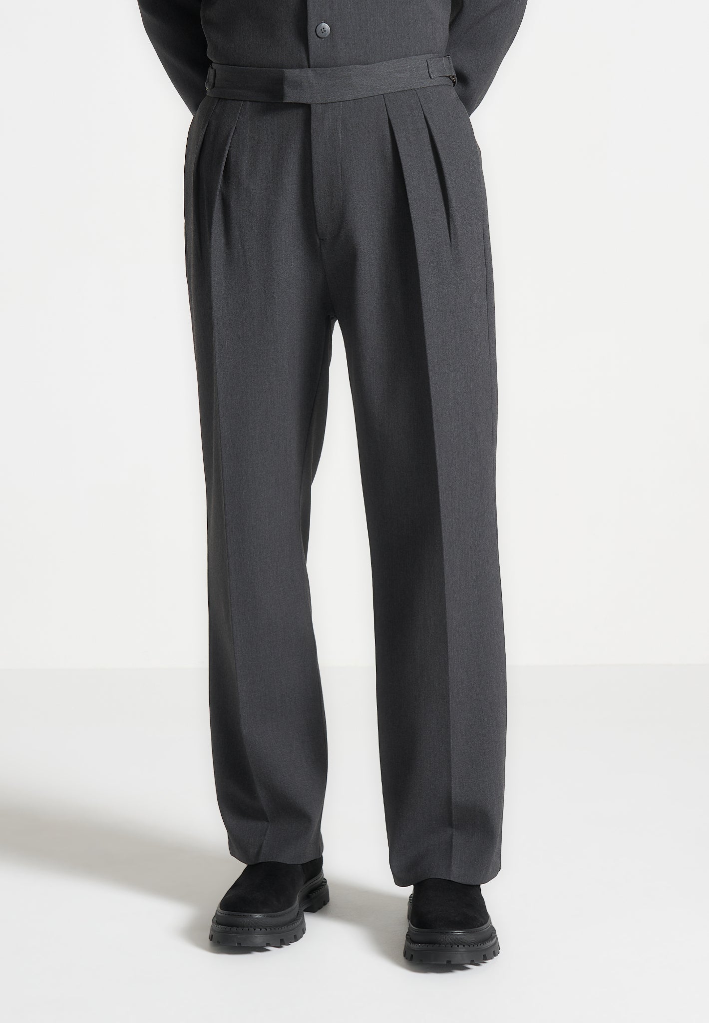 Elevate your wardrobe with our Hatched Pleated Tailored Trousers in Grey, offering a relaxed fit for enduring comfort throughout the day. With side slip pockets and a pleat to crease detail, these trousers effortlessly blend practicality with style. Perfect for both smart casual and formal occasions, these versatile trousers are a must-have addition to your collection.