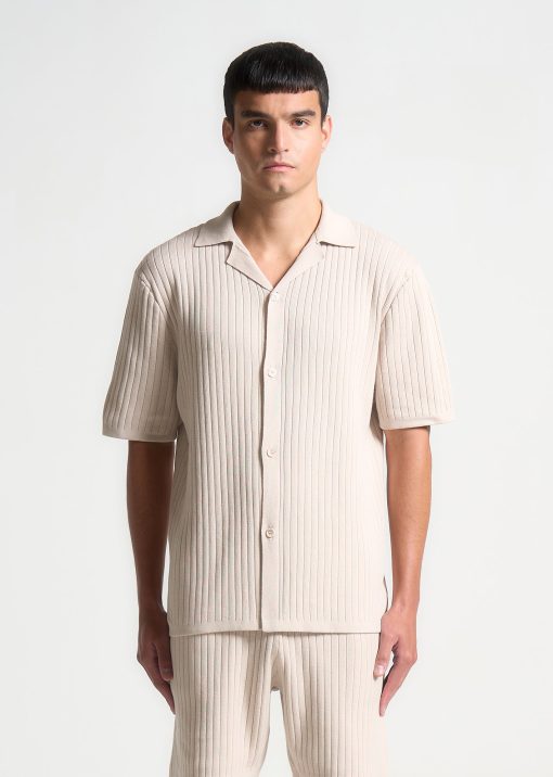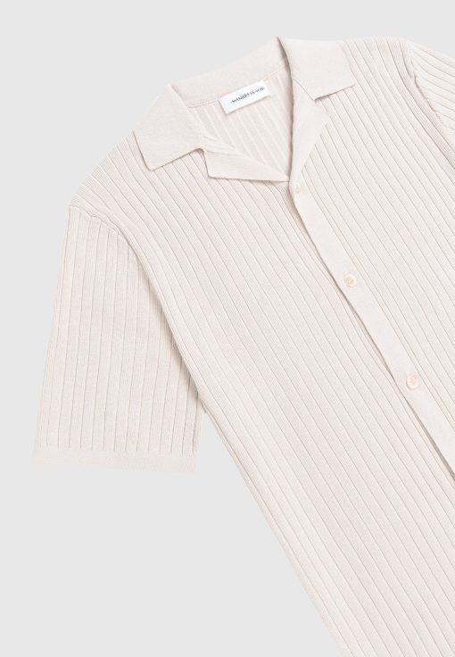 Crafted from a soft and durable knit material, the Ribbed Knit Revere Shirt offers comfort and style. The ribbed fabric adds texture while the short sleeve silhouette and revere collar create a classic yet modern look. Perfect for any occasion, this shirt is a must-have for your wardrobe.