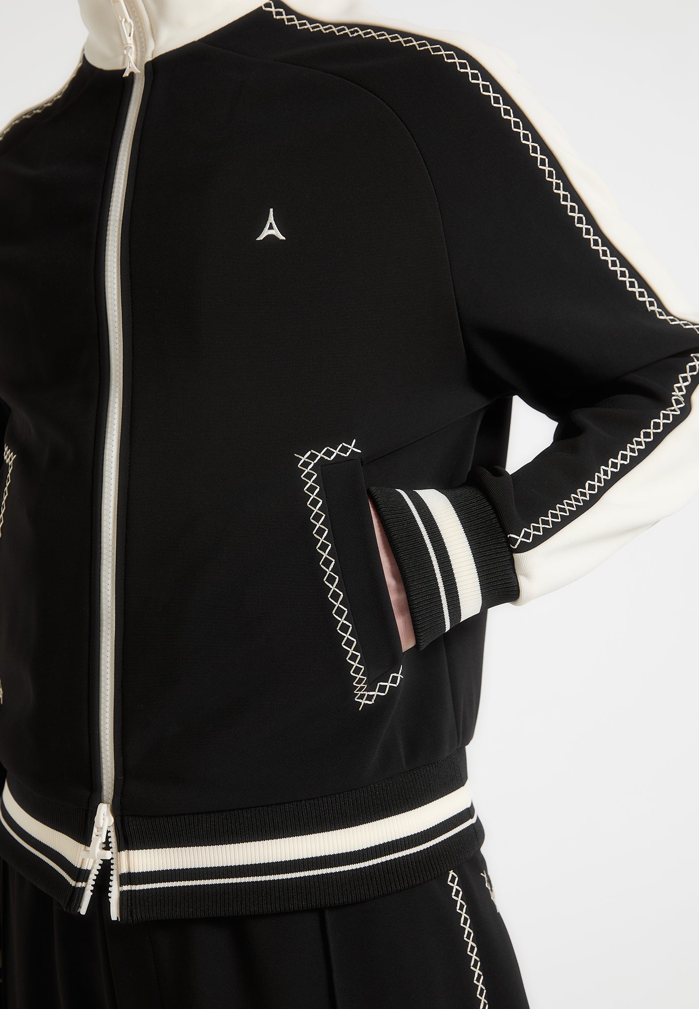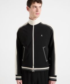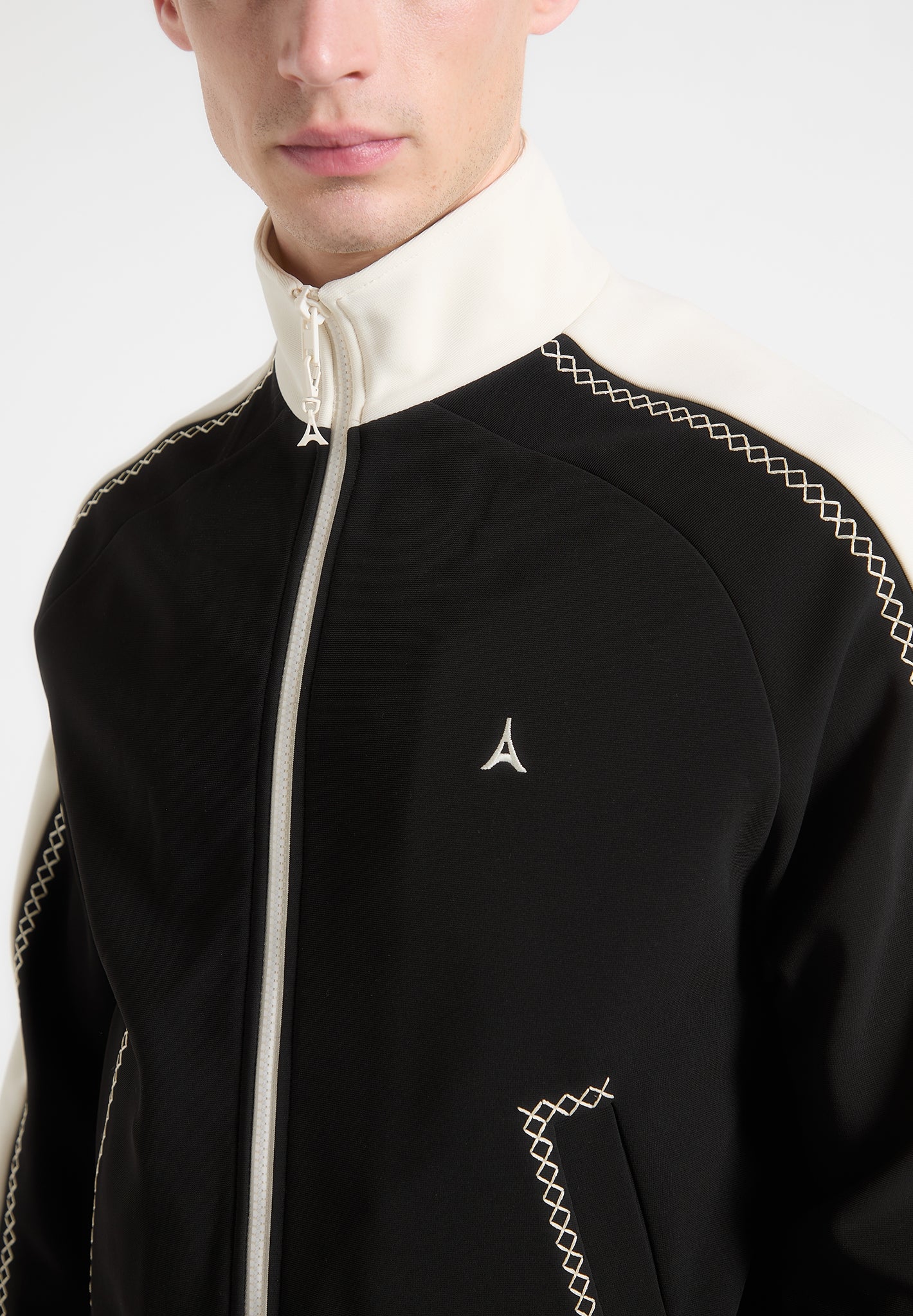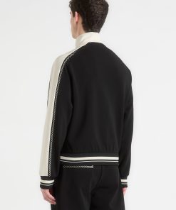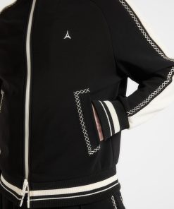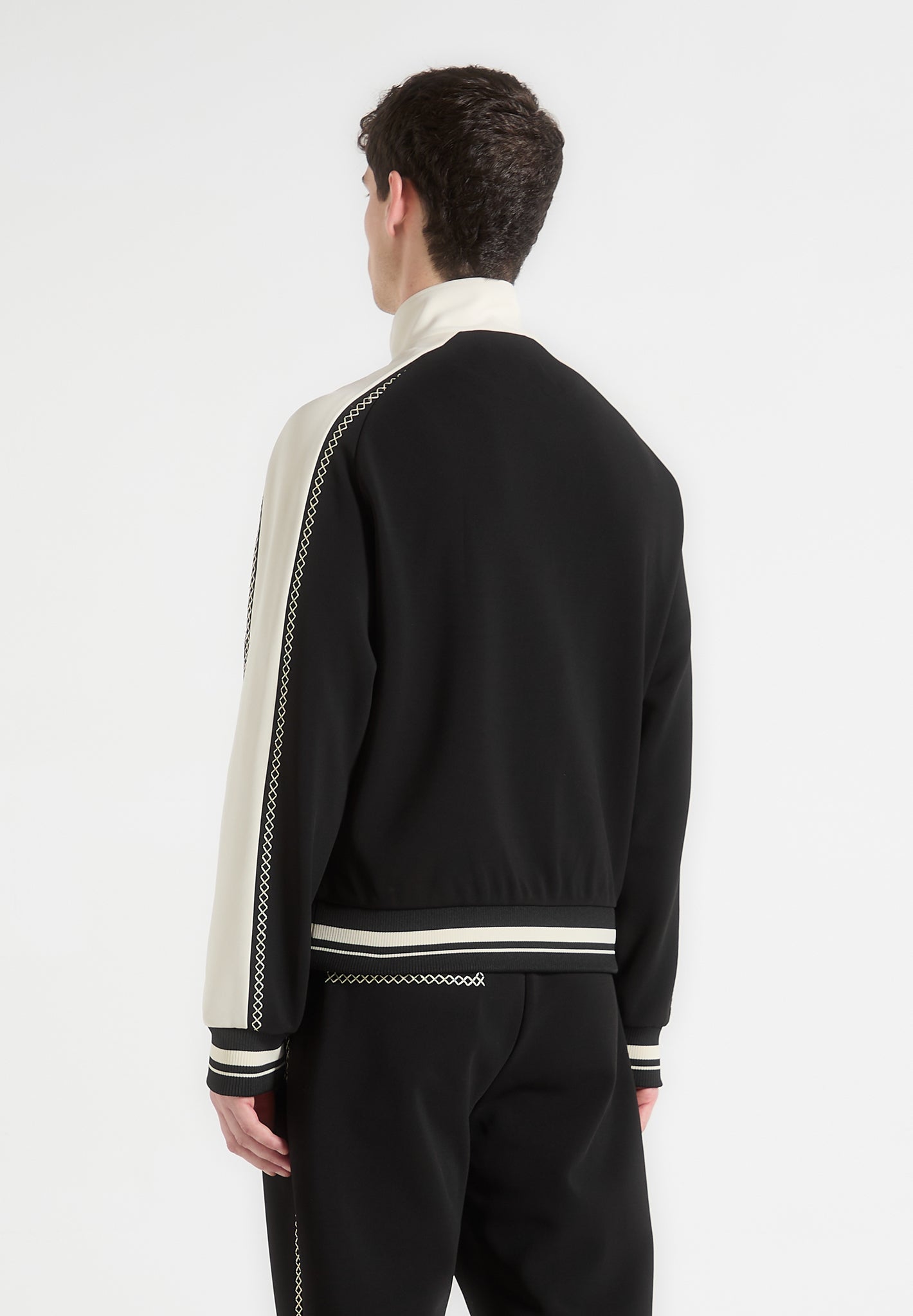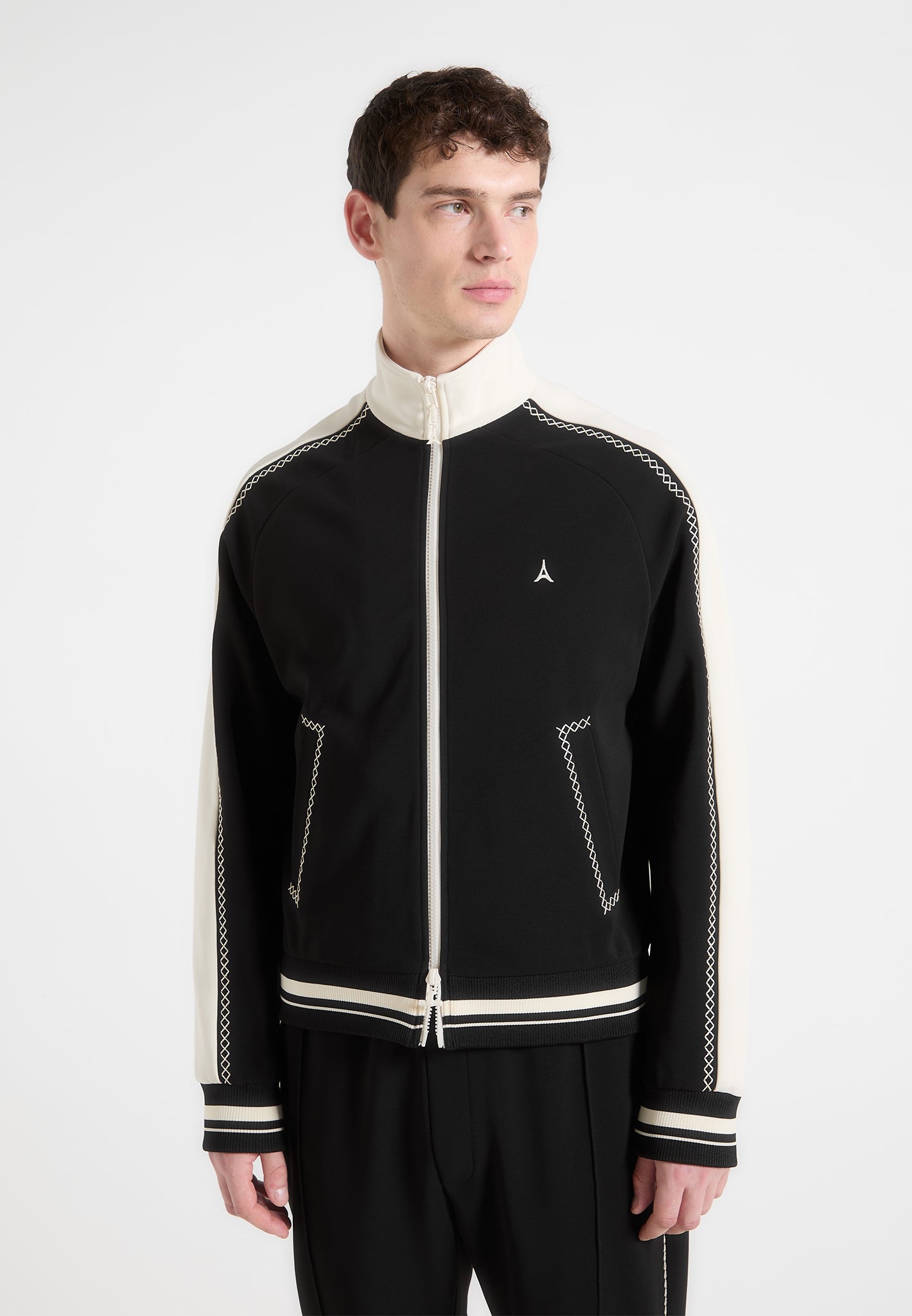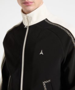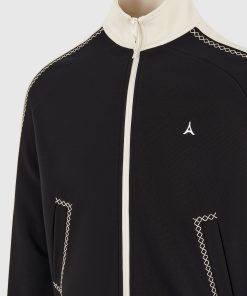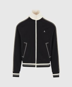 The Contrast Whipstitch Raglan Track Jacket combines athletic influence with precision craftsmanship. Defined by whipstitch contrast trims running across the shoulders and sleeves, the jacket features a raglan construction for enhanced movement and a streamlined fit. The high funnel neck, stripe ribbing, and sharp panelling elevate this from sportswear to standout statement.