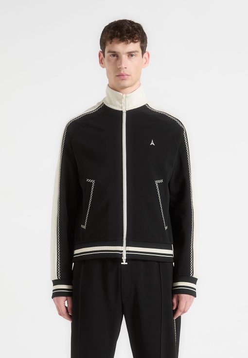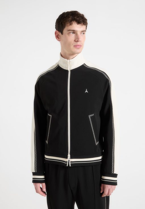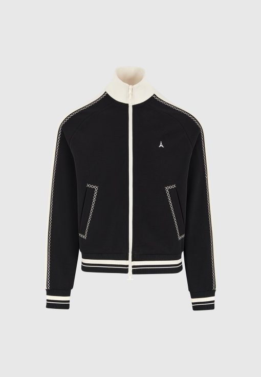 The Contrast Whipstitch Raglan Track Jacket combines athletic influence with precision craftsmanship. Defined by whipstitch contrast trims running across the shoulders and sleeves, the jacket features a raglan construction for enhanced movement and a streamlined fit. The high funnel neck, stripe ribbing, and sharp panelling elevate this from sportswear to standout statement.