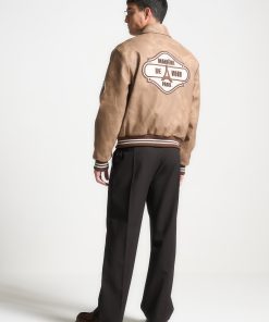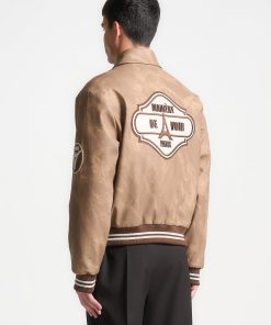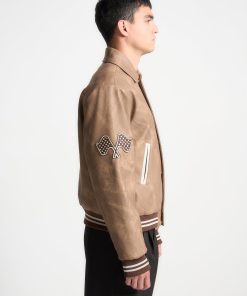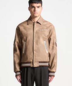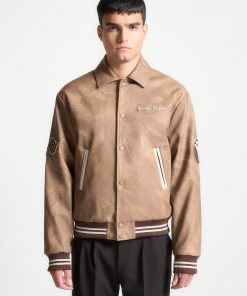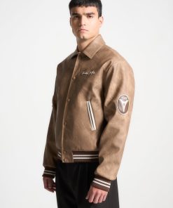 Introducing our Vintage Marble Varsity Jacket in Brown. This jacket combines a classic retro silhouette with contemporary flair, featuring premium vegan leather and distinctive appliquéd branding. Accented with striped detailing on the hem and cuffs, and finished with a practical popper button closure, it offers the perfect blend of style and functionality.