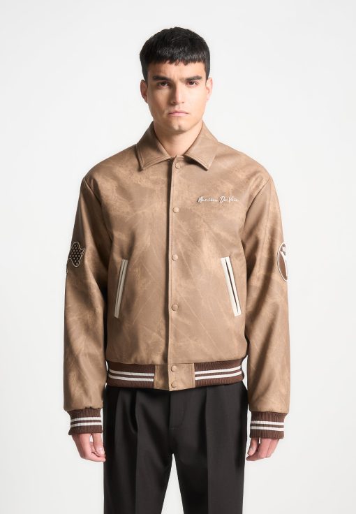 Introducing our Vintage Marble Varsity Jacket in Brown. This jacket combines a classic retro silhouette with contemporary flair, featuring premium vegan leather and distinctive appliquéd branding. Accented with striped detailing on the hem and cuffs, and finished with a practical popper button closure, it offers the perfect blend of style and functionality.