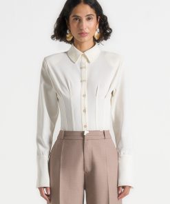 Introducing the Corset Shirt Bodysuit in Off-White. This stylish garment features a contoured shirt design, providing a flattering and comfortable fit. Made with quality materials, this bodysuit is perfect for any occasion.