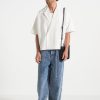 Introducing the Corset Shirt Bodysuit in Off-White. This stylish garment features a contoured shirt design, providing a flattering and comfortable fit. Made with quality materials, this bodysuit is perfect for any occasion.