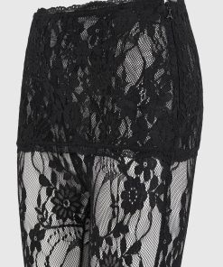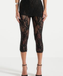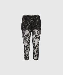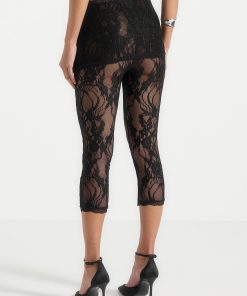 Designed to make a statement, these capri lace leggings bring a sensual edge to modern layering. Crafted from delicate floral lace, they feature an asymmetric waistband and a form-fitting silhouette that finishes just below the knee. The semi-sheer design is both bold and versatile—ideal for styling under oversized shirting, longline blazers, or coordinating lace pieces for a head-to-toe sheer moment.