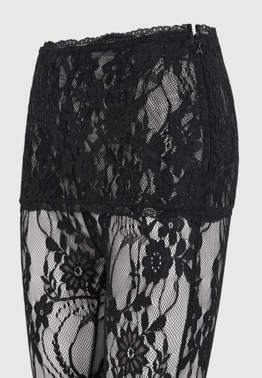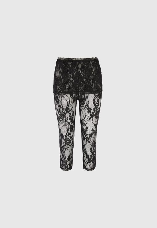 Designed to make a statement, these capri lace leggings bring a sensual edge to modern layering. Crafted from delicate floral lace, they feature an asymmetric waistband and a form-fitting silhouette that finishes just below the knee. The semi-sheer design is both bold and versatile—ideal for styling under oversized shirting, longline blazers, or coordinating lace pieces for a head-to-toe sheer moment.