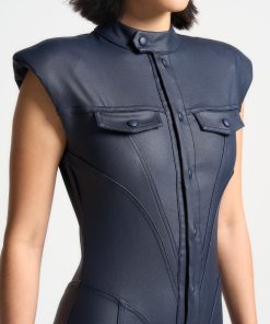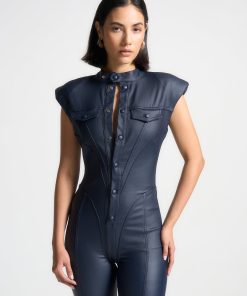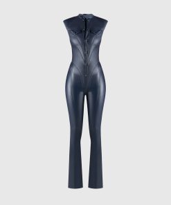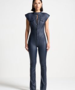 Expertly crafted with wax coating, this jumpsuit accentuates your shape with its figure flattering design and contour detailing. Its shoulder pads add structure and elegance, making it a versatile choice for any occasion. Showcase your confidence and style in this must-have jumpsuit.