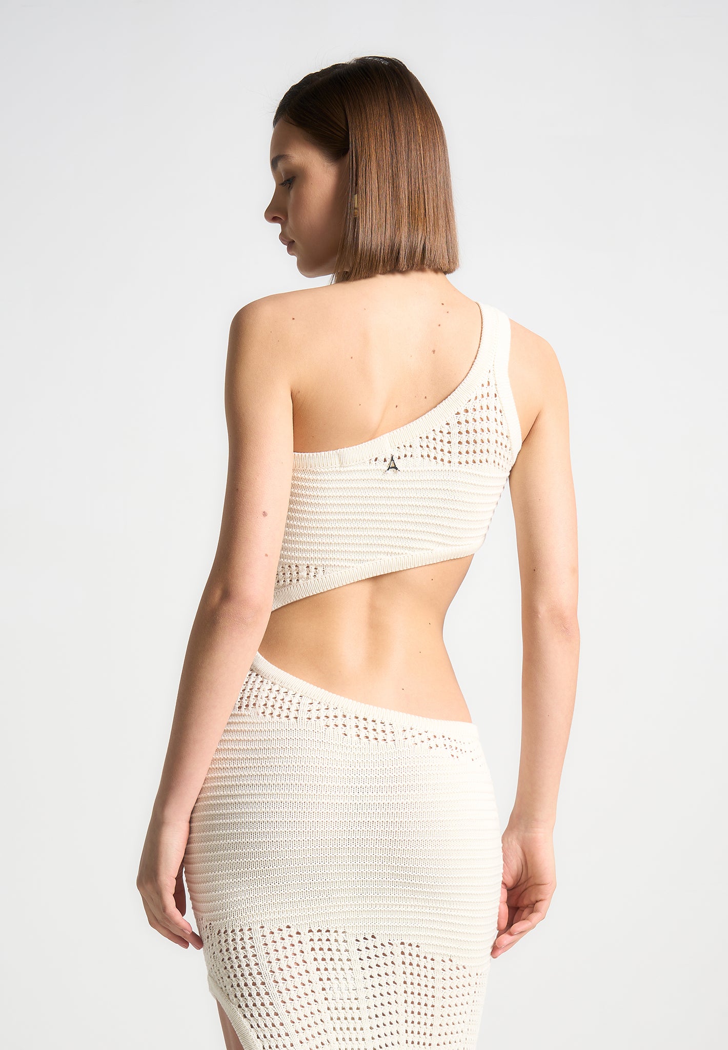 Expertly crafted and designed, this Asymmetric Crochet Knit Cut Out Maxi Dress in Cream features alternate knit panels for a unique and eye-catching look. Its soft knit fabric provides all-day comfort, while the asymmetric design adds a touch of elegance. Stand out from the crowd in this stunning maxi dress.