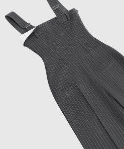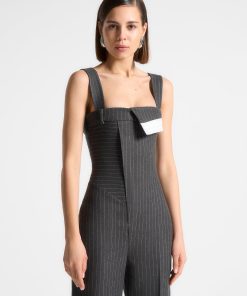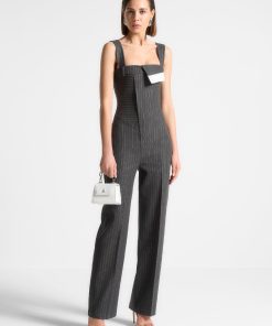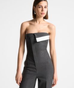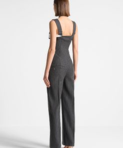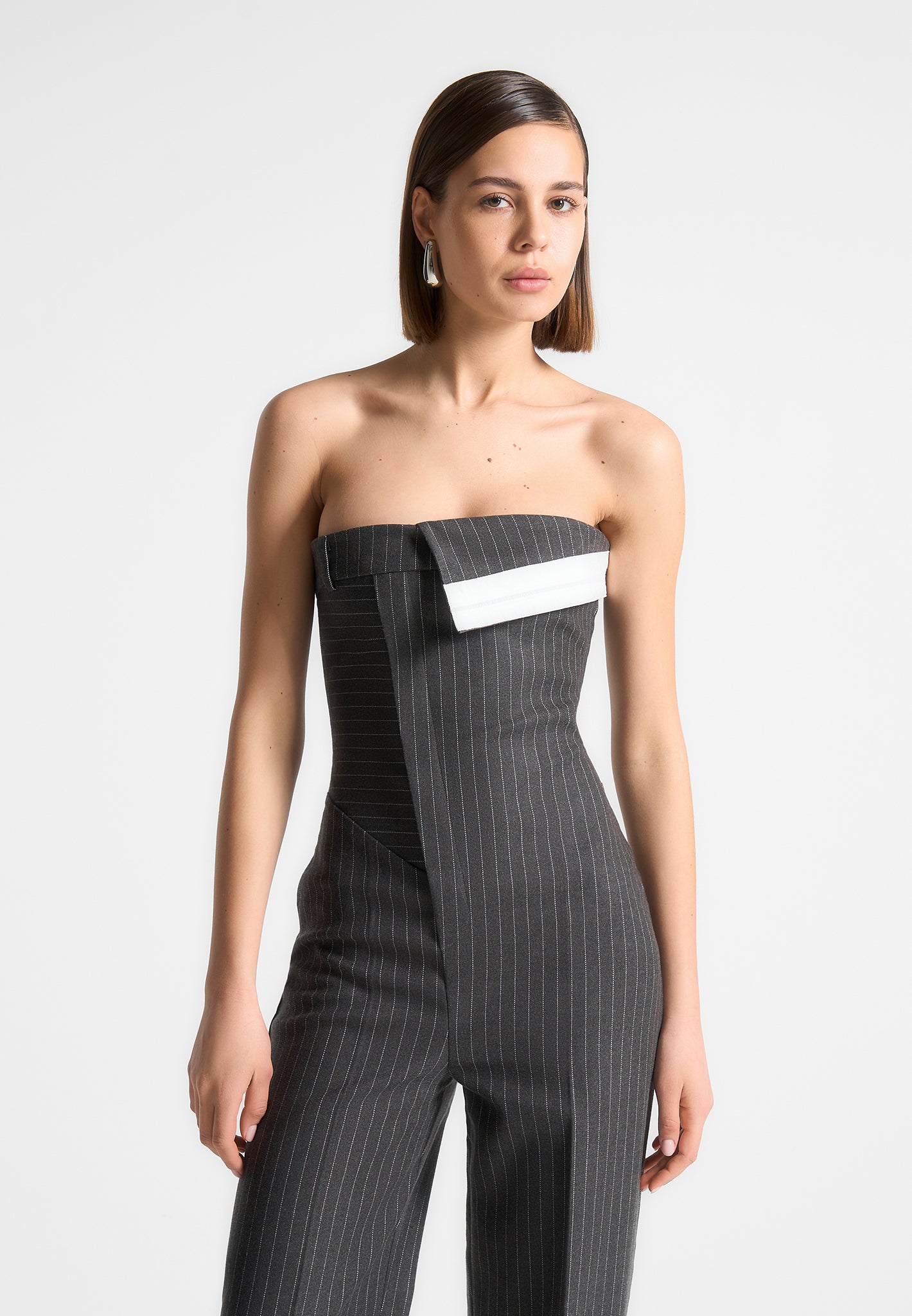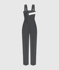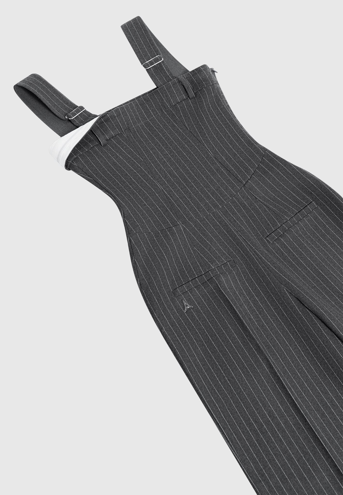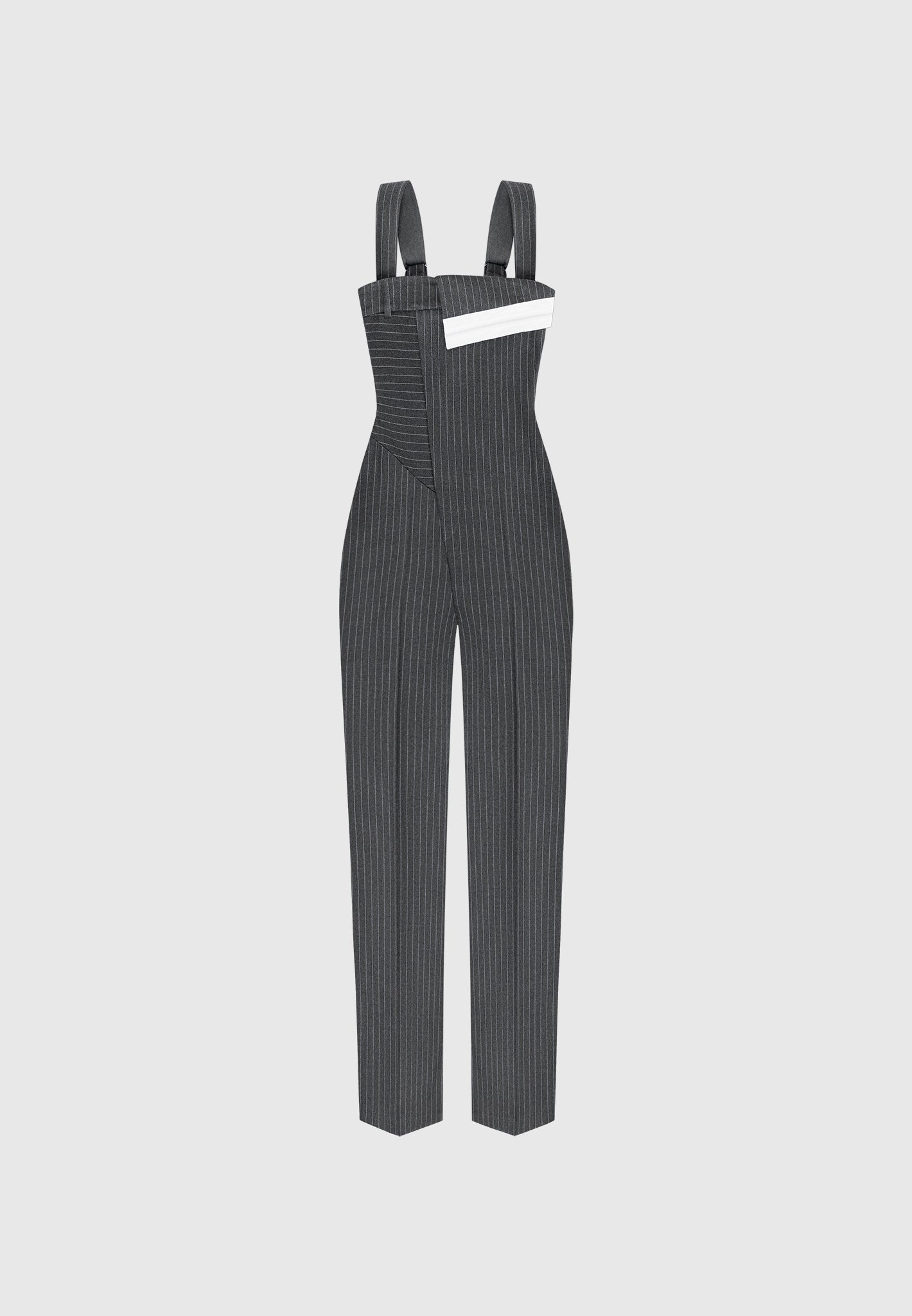 This tailored jumpsuit features detachable straps for versatile styling options and a classic pinstripe pattern for a timeless look. With a tailored fit, this jumpsuit flatters your figure for a sleek and sophisticated appearance. Elevate your wardrobe with this versatile and elegant piece.