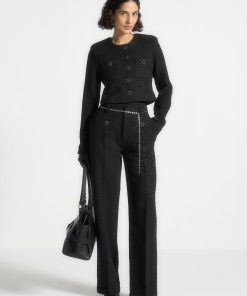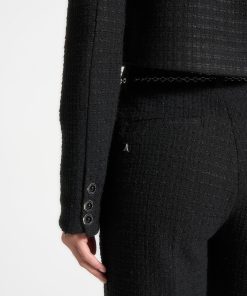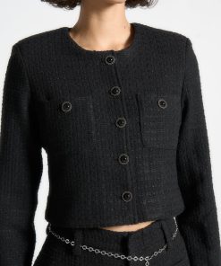 This jacket is designed with a cropped, fitted, and tailored silhouette. Its classic design exudes sophistication and style, making it a versatile piece for any occasion. Expertly crafted with tweed and pearl accents, this jacket offers an elegant and refined touch to your wardrobe.