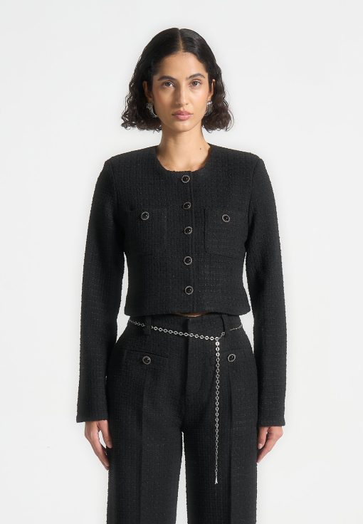 This jacket is designed with a cropped, fitted, and tailored silhouette. Its classic design exudes sophistication and style, making it a versatile piece for any occasion. Expertly crafted with tweed and pearl accents, this jacket offers an elegant and refined touch to your wardrobe.