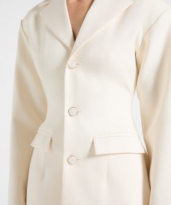 - The wide shoulder blazer silhouette creates a structured, tailored look