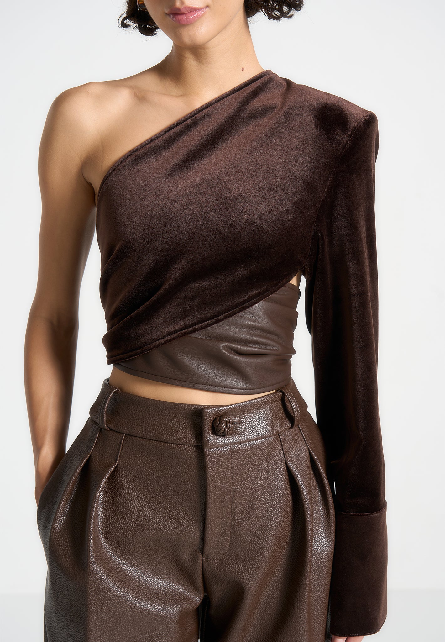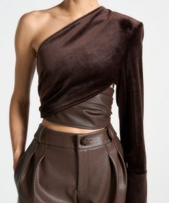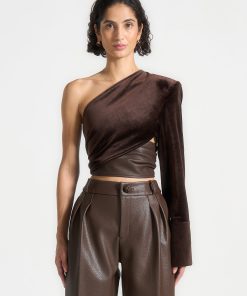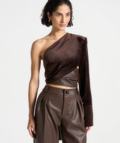 Elevate your style with our One Sleeve Velour Wrap Top in Brown. The striking design combines contrasting fabrics for a bold and modern look. The voluminous tie adds a touch of sophistication, while our sustainable alternative to leather ensures a stylish and conscious choice. Perfect for any occasion.