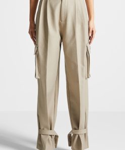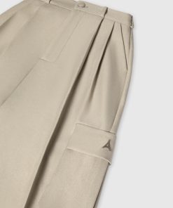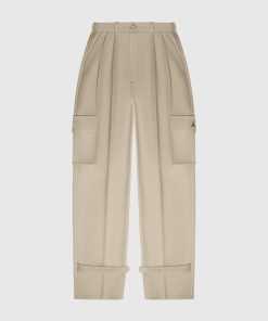 Our Tailored Pleated Cargo Trousers, crafted in beige, feature a tailored fit for a sleek silhouette, as well as cargo features for enhanced utility. The trousers have a wide-leg cut that is perfect for an effortless look.