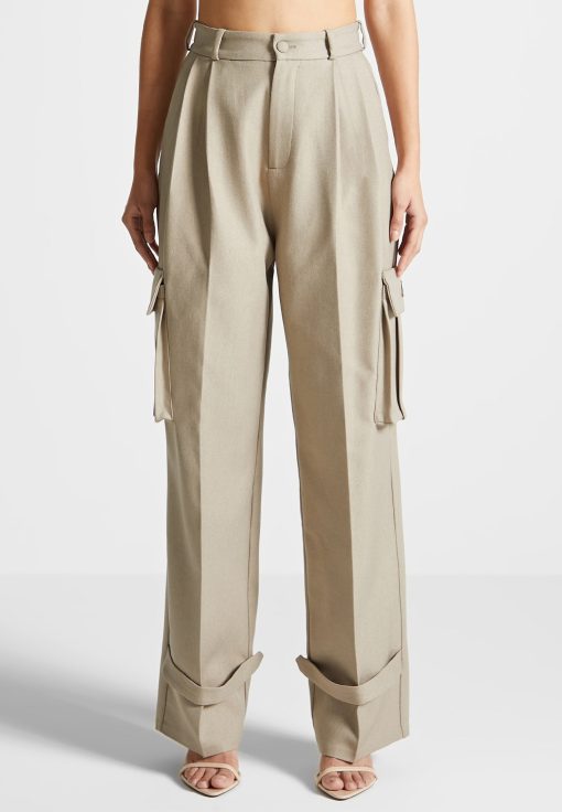 Our Tailored Pleated Cargo Trousers, crafted in beige, feature a tailored fit for a sleek silhouette, as well as cargo features for enhanced utility. The trousers have a wide-leg cut that is perfect for an effortless look.