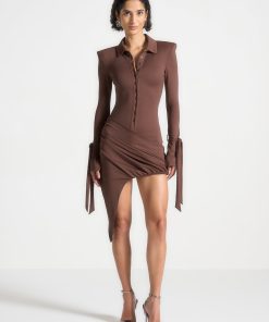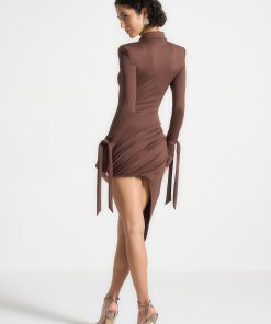 This elegant mini dress features a flattering fit and draped skirt, complemented by wide shoulders and wrist ties for added style and detail. Perfect for any occasion, this dress is a versatile addition to any wardrobe.