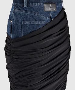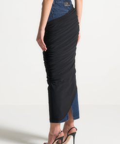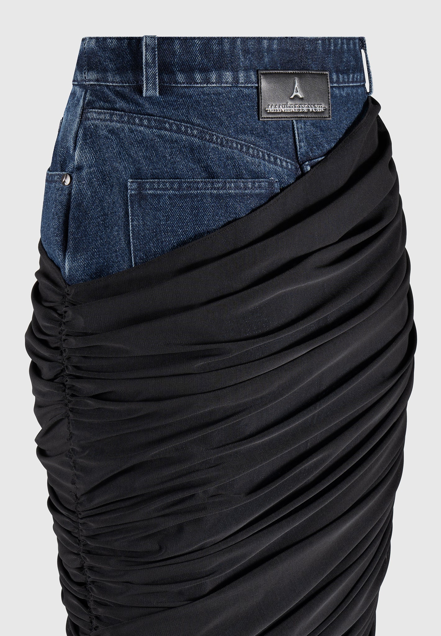 Expertly crafted with high-quality denim, the Draped Mesh Denim Maxi Skirt puts a unique spin on a timeless design. Dress it up or down for any occasion and elevate your wardrobe with this versatile piece.