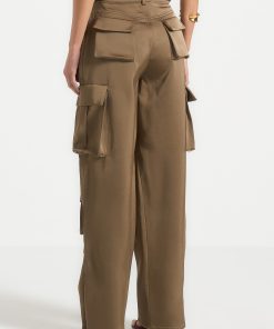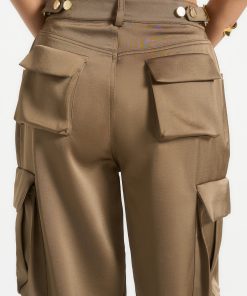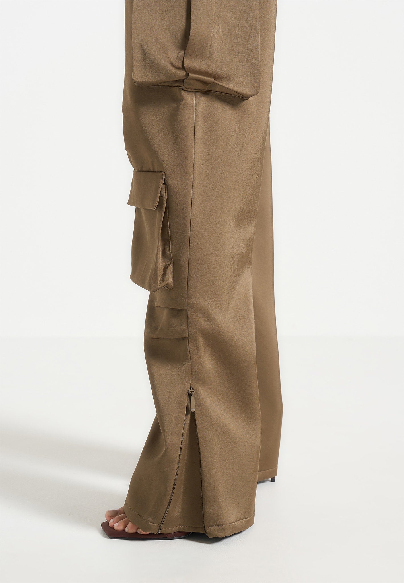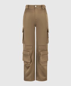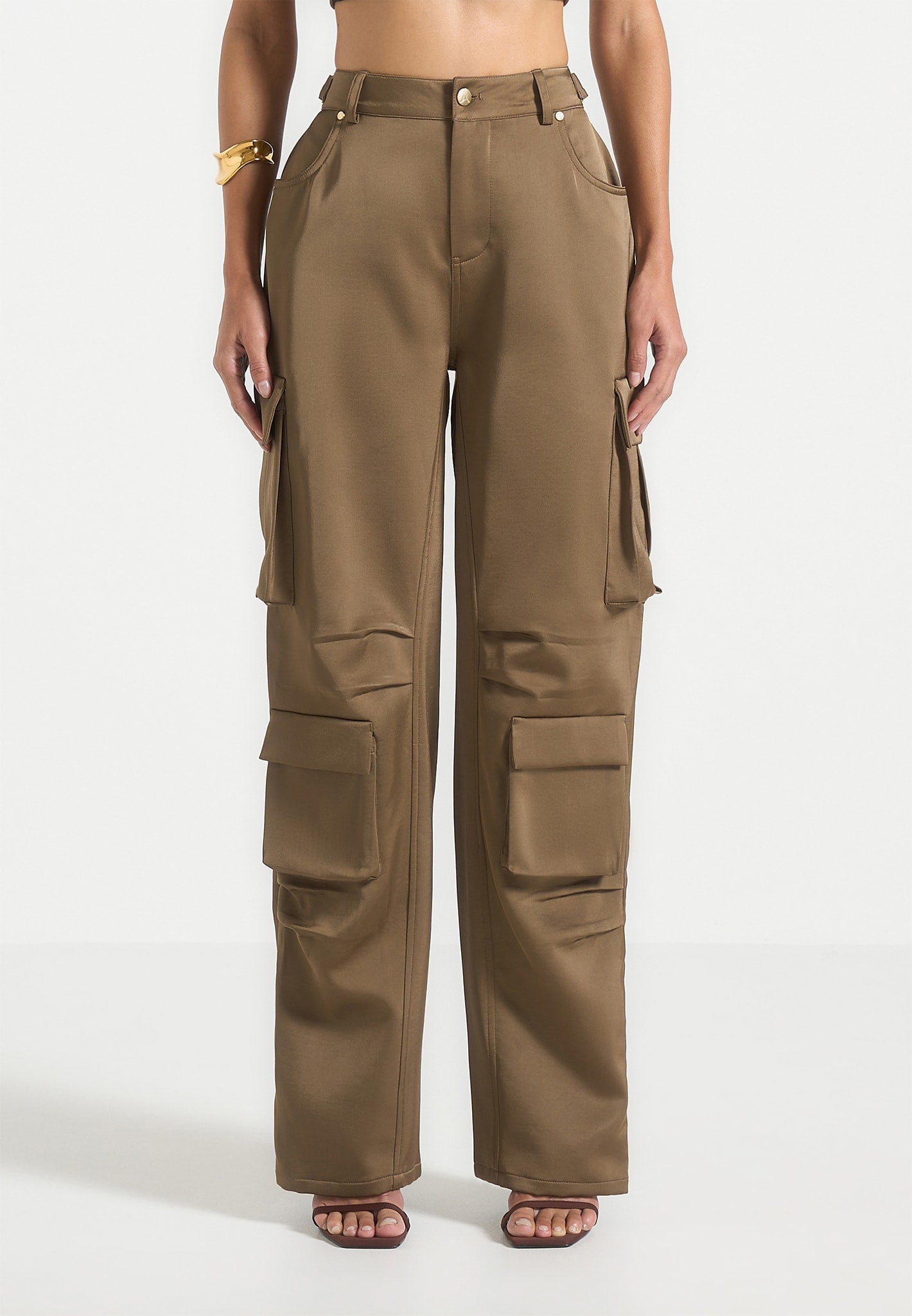 These wide-leg cargo trousers merge elevated fabric with utilitarian function. Crafted from a satin-finish woven material, they feature a mid-rise fit with a clean waistband, signature branded hardware, and multiple flap pockets for practical edge. The full-length silhouette is relaxed yet structured, designed to bring movement and statement styling to both casual and polished looks.