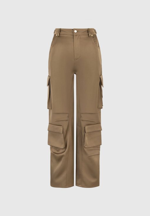 These wide-leg cargo trousers merge elevated fabric with utilitarian function. Crafted from a satin-finish woven material, they feature a mid-rise fit with a clean waistband, signature branded hardware, and multiple flap pockets for practical edge. The full-length silhouette is relaxed yet structured, designed to bring movement and statement styling to both casual and polished looks.
