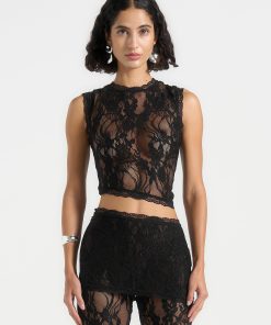 Delicate yet defined, this sleeveless lace top brings a romantic sensibility to contemporary dressing. Crafted from sheer floral lace, it features scalloped edging, a high neckline, and a form-fitting silhouette that enhances its feminine shape. The opaque bandeau lining offers just enough coverage while allowing the intricate pattern to take centre stage. Perfect for layering under tailoring or styled solo for a bold, elegant statement.