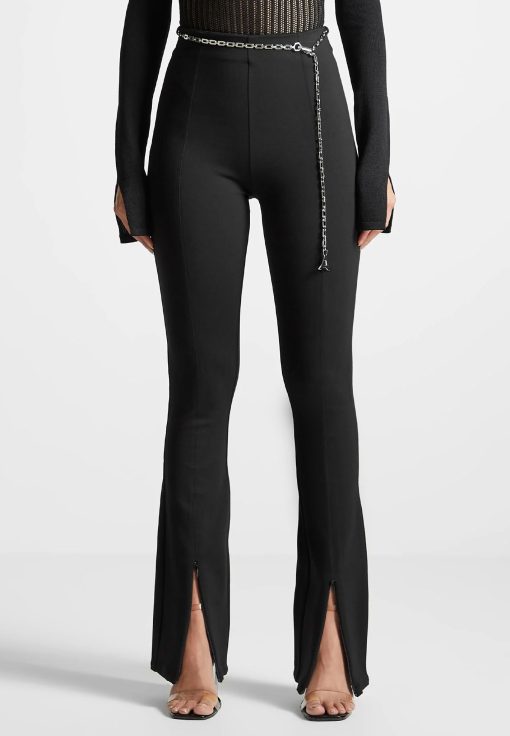 These fit and flare leggings feature dynamic split hems and a high waisted fit. The unique chain detailing is a stylish add-on and adds to the timelessness of the piece. Perfect for a night out or any other special occasion.