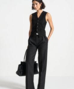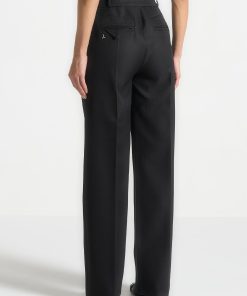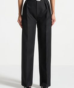 These trousers feature twin pleats and a straight leg, creating a relaxed and comfortable fit. The straight leg fit and pleat detail give a polished, tailored look, perfect for any occasion from day to night. The mid-rise waist flatters the figure creating a classic and timeless look.